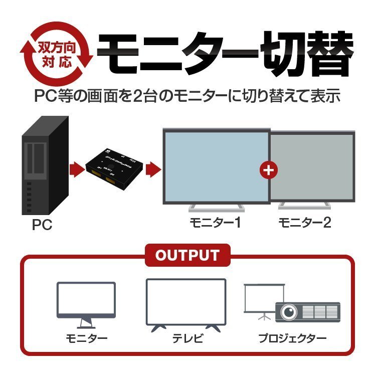 また双方向にも対応しているので、1台のPCを2台のディスプレイ等に切り替えて表示も可能。