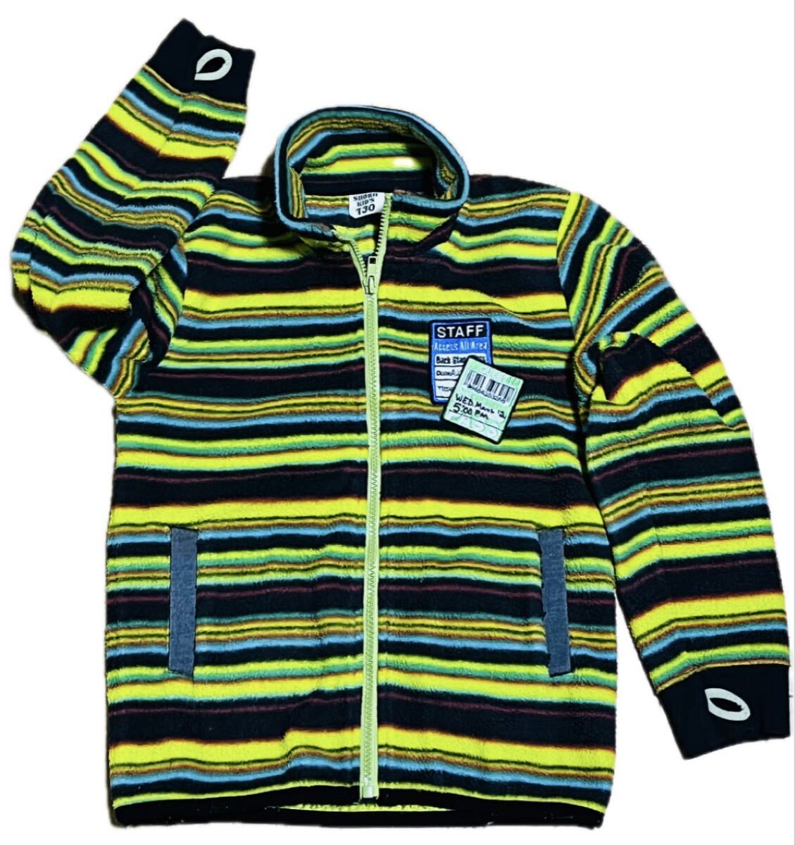サイズは130cmで、フロントはジップアップ仕様です。左胸には「STAFF」と書かれたワッペンが付いています。