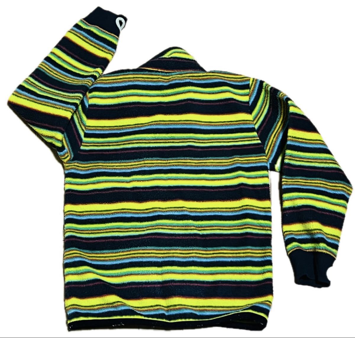 カラフルなボーダー柄が特徴のキッズ用フリースジャケットです。