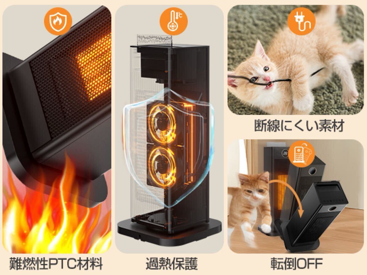 【四つモード・メモリー機能】エコ知能モードで、15℃~45℃まで1℃ずつ設定可能、好きな温度に応じて調整できる、省エネと快適な温度を両立させます。さらに、自然風モード(8W)、中温風(800W)、高温風(1500W)を選択でき、状況に合わせて自由に切り替え、さまざまなニーズに対応します。電気ファンヒーターの電源をオフにする時、ファンが引き続き運転「30秒送風散熱機能」、内部の熱量が冷却して事故を防ぎます。更に言えば、ファンヒーターにはメモリー機能も搭載、前回電源OFF時の設定した状態を保持し、無駄な繰り返し操作を省きます。