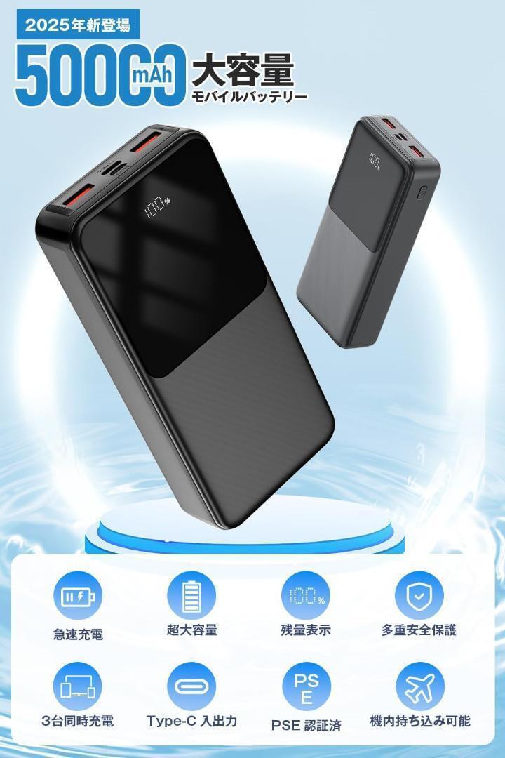 モバイルバッテリー 大容量【50000mAh・2025新登場】 22.5W/PD20W 急速充電 Type-C出入力 3台同時充電 携帯充電器 LED残量表示 iPhone/Android/iPad全機種対応 PSE認証済 iPhone16充電 器 旅行/出張/停電/地震/防災グッズ【災害時にも便利】
