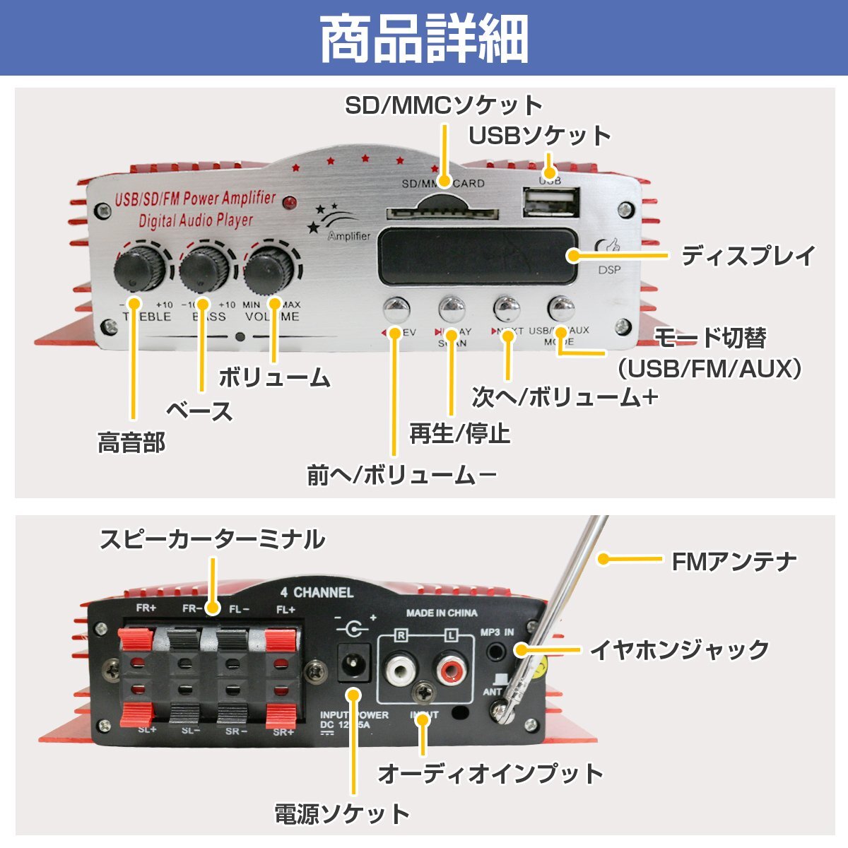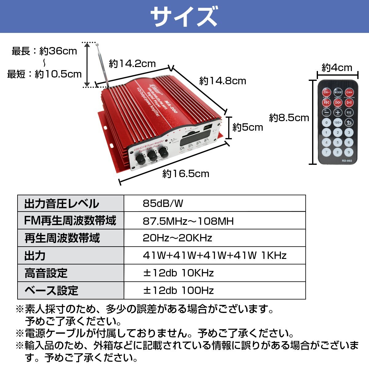 12V ステレオ オーディオ アンプ 4ch 出力 リモコン付き MP3 スピーカー ウーファー アンプ 再生機 高出力 SD USB FMアンテナ