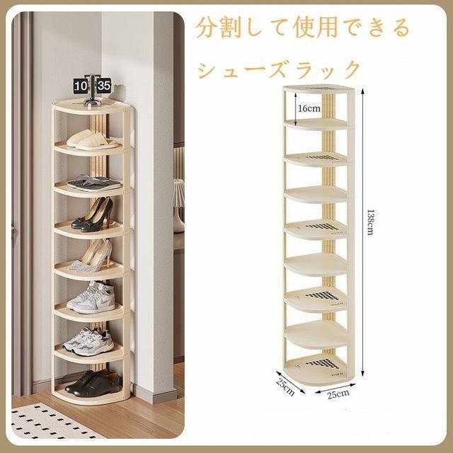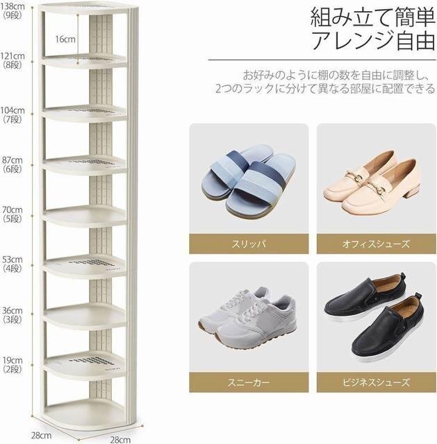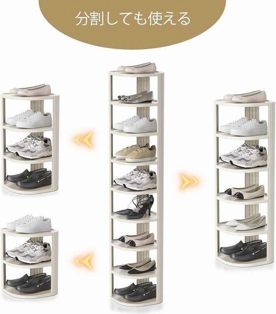 靴一足ぶんのスペースで縦向きに9足ぶんの靴を入れられるので、スペースの少ない玄関にオススメです。 分けて使用できますので,スペースの高さに合わせてご利用いただけます。 好みの高さや収納する靴の数に合わせて自由に分けられるのが当商品の魅力です。 PPプラスチック素材なので,金属製品と木材のように錆びたり、腐食したりすることがなです。バスルームのような湿度が高い場所で収納ラックとして使用するのもおすすめです。 組み立て簡単、工具不要、パーツを差し込むだけで簡単に組み立てられます。 圧迫感のないオープンタイプで、出し入れもラクラクです。 見やすく取り出しやすいので、忙しい朝の身支度もスムーズ。 普通の収納ラックとしても使用できます。 リビングルーム、寝室、キッチンなどにも適用します。雑誌、ぬいぐるみ、衣類、スナックなどの収納も適用です。