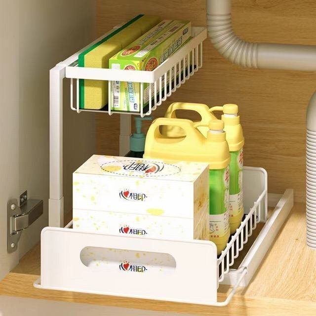 焼付け塗装で錆びにくくので、お手入れは簡単になります。雑巾で拭くことも丸洗いことも可能。ゴム製足で、滑りにくく家具にキズも付けません。2段引き出しデザインでシンク下に置きても引きのみで中の収納物を簡単に取り出します。2個引き出しがあるこそ、分類収納できます。