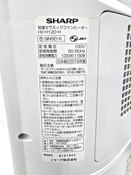 【中古品】 シャープ SHARP 加湿セラミックファンヒーター HX-H120-H 2018年製 ○YR-18389○