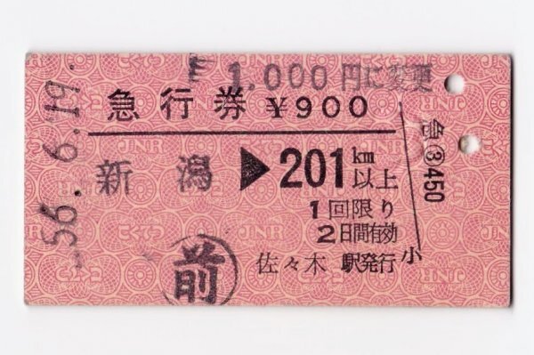 ●国鉄●白新線☆佐々木駅駅発行【 新潟→201km以上 急行券 900円 ▲三角矢印 】A型券 昭和56年 【00326】裏面 □戦 □後払