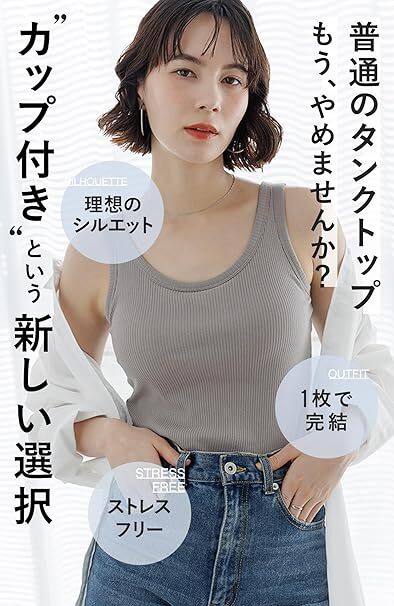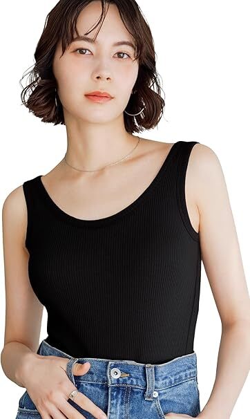 【1枚でお出かけできるリブタンクトップ】1枚でトップスとして使用できるカップ付きタンクトップ。程よく開いたデコルテデザインでジャケットにレイヤードして着用も可能。カジュアルでもきれいめでもシーンに合わせてご利用いただけます。