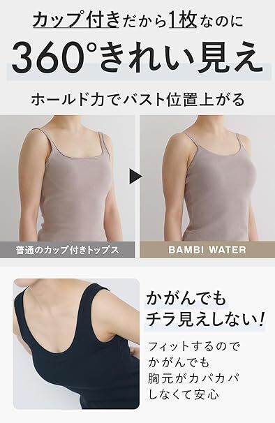 【1枚で360°きれい見え、BAMBI WATERのカップイントップス】スタイル ナイトブラ の機能をブラトップに融合。高い ホールド感 と特殊構造パッドの補正力で ブラトップ なのにバスト位置が上がる!新体験の カップ付き タンクトップ。コットン混素材の心地よい着心地で ルームウェア やデイリーウェアとしてもおすすめです♪