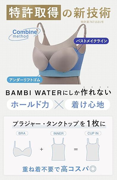 【BAMBI WATERにしか作れない!特許取得の新技術”combine製法”】「編み」と「縫う」異なる2つの製法を融合した”combine製法”がこの度「特許」を取得しました!※特許第7671531号※。独自製法を用いて作られたブラトップはホールド力と着け心地を両立し、他にはない フィット感 で 脇肉 背肉を集めてバストの 横流れ もしっかり防止してくれます。商品のデザインについても他に類似がないと認められ「意匠権」にも登録されました。