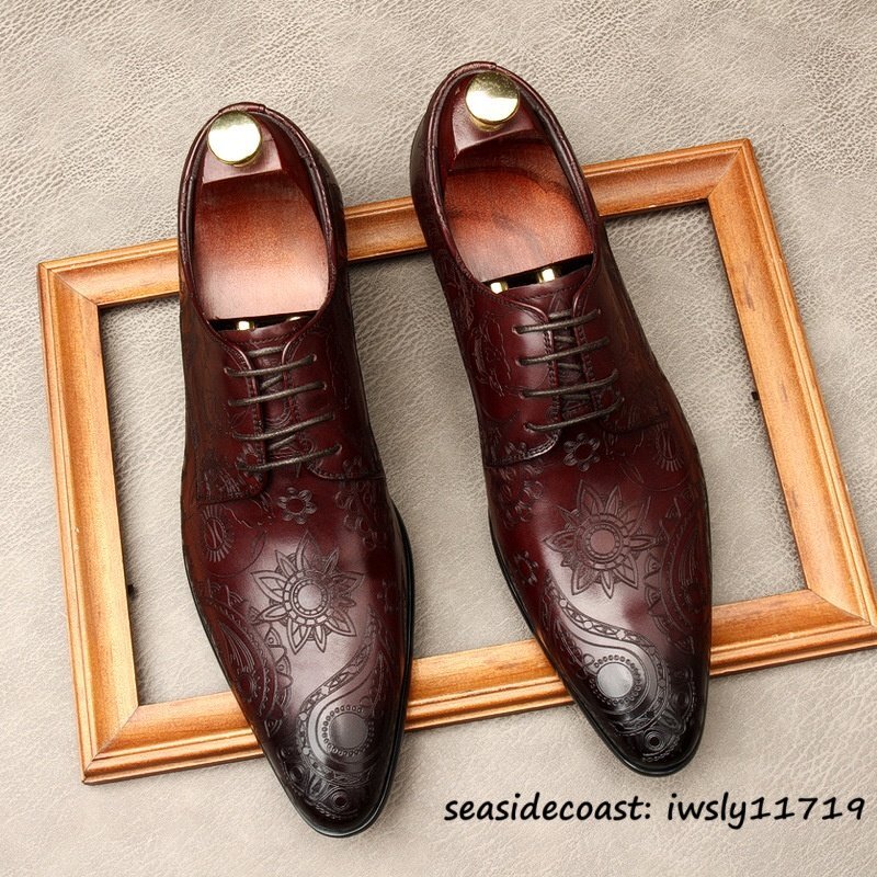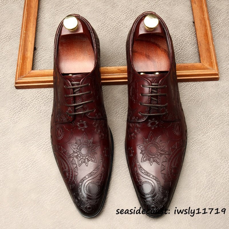 定価11万超★最高級 ビジネスシューズ 本革 レザーシューズ 超希少 職人手作り 総柄 牛革 紳士靴 メンズ フォーマル 革靴 レッド 27.5cm