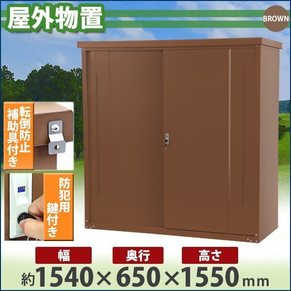 | 商品名 | 送料無料 屋外物置 スチール製 家庭用収納庫 鍵付き ブラウン 幅約1540mm×奥行約650mm×高さ約1550mm 倉庫 納屋 物置き スチール物置 スチール収納庫 ガレージ 収納 可動棚 吊り戸 吊戸 吊り扉 上吊り 吊引き戸 庭 ガーデン 茶 monookishw15d60h15br |