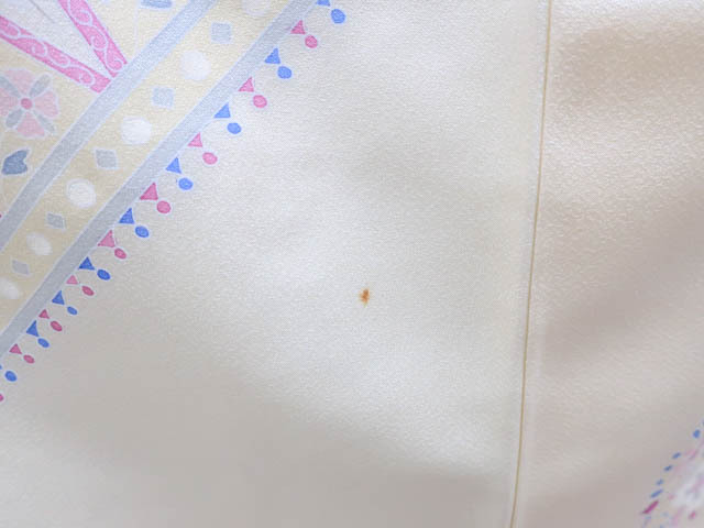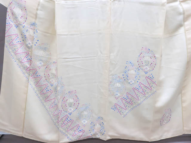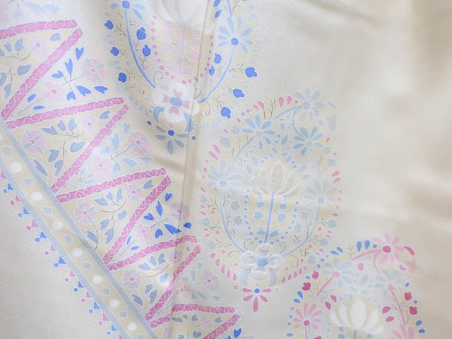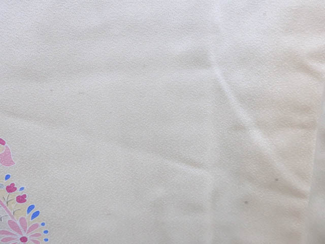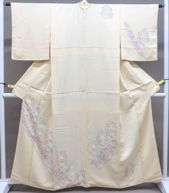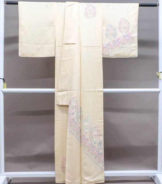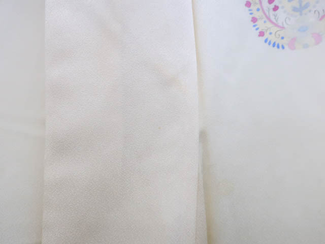 リサイクル商品のため、八掛に点シミ、衿・左胸辺り・後ろ身頃にシミがございますがご着用いただけると存じます。 地色はクリームです。 1枚目の画像が近いお色かと思われます。 素材は正絹です。 |