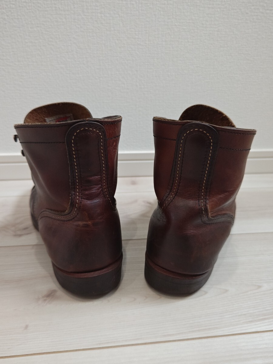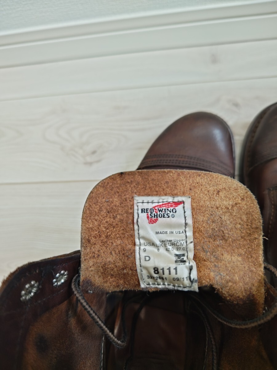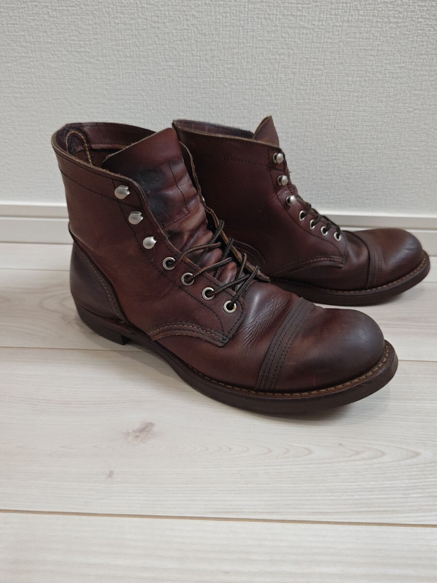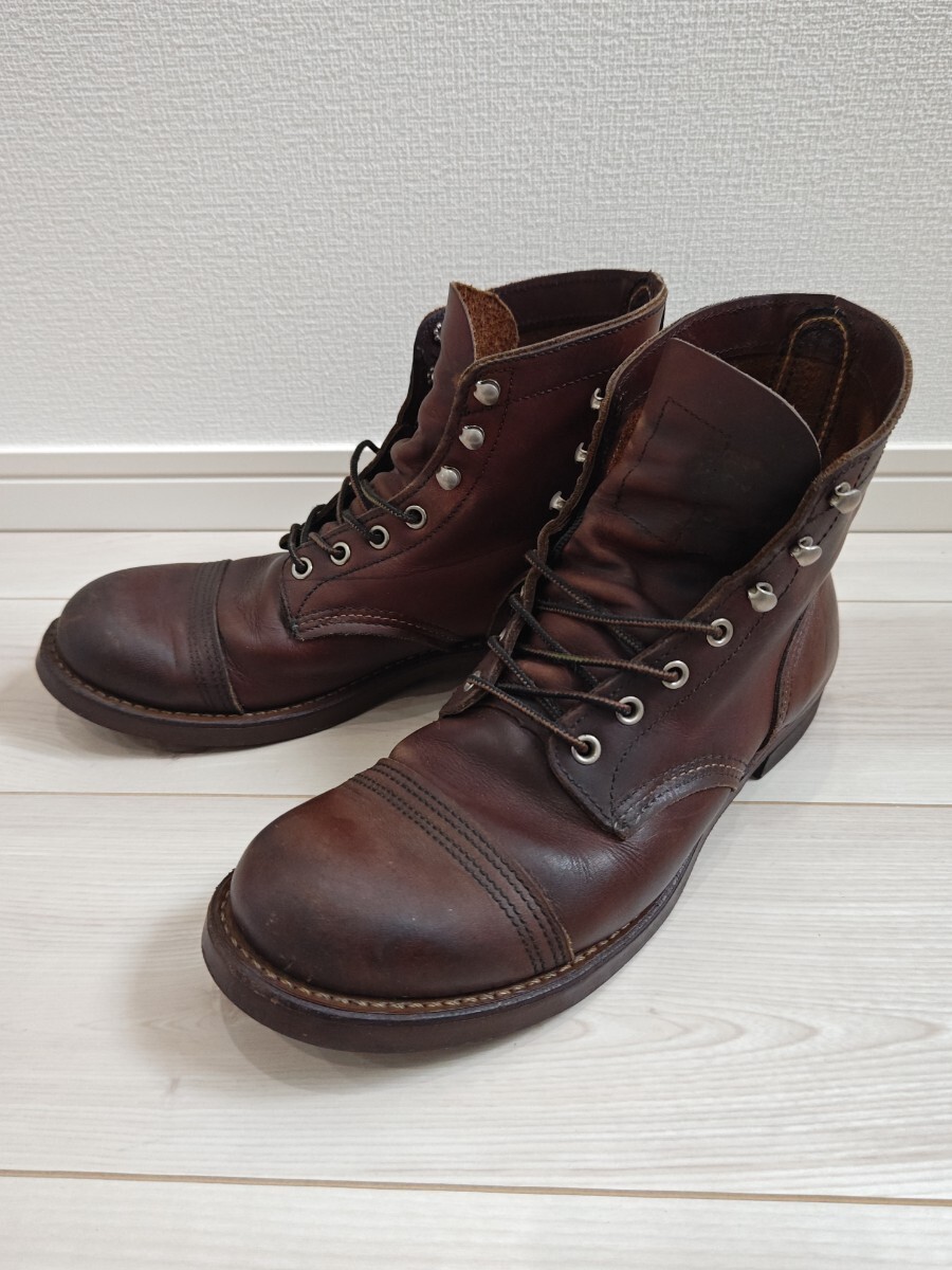 REDWING製のワークブーツ 8111 アイアンレンジャーになります。サイズは27cm US9でカラーはアンバーです。アイアンレンジャーの名の通り20世紀初頭に鉱山で働く鉱夫のために作られたキャップドトゥデザインのワークブーツです。レースアップタイプですので細身のデニムや大人っぽいファッションにも合わせやすいかと思います。商品の状態ですが5万円ほどで新品購入し、数シーズン履いておりました。寒い季節に使用し、春先、秋口にはクリーニング・ミンクオイルにて保湿を行い、夏場は一切使用せず、つま先に除湿バックを入れ大切に保管しておりました。程よいレザーの使用感が出ていて格好良くなってきています。踵の減りは有りますがまだまだ活躍してくれると思います。ファッションの趣向が変わり、眠らせたままになっておりましたので有効に活用してくださる方にお譲りいたします。自己紹介欄をご確認の上、ノークレーム、ノーリターンでお願いいたします。