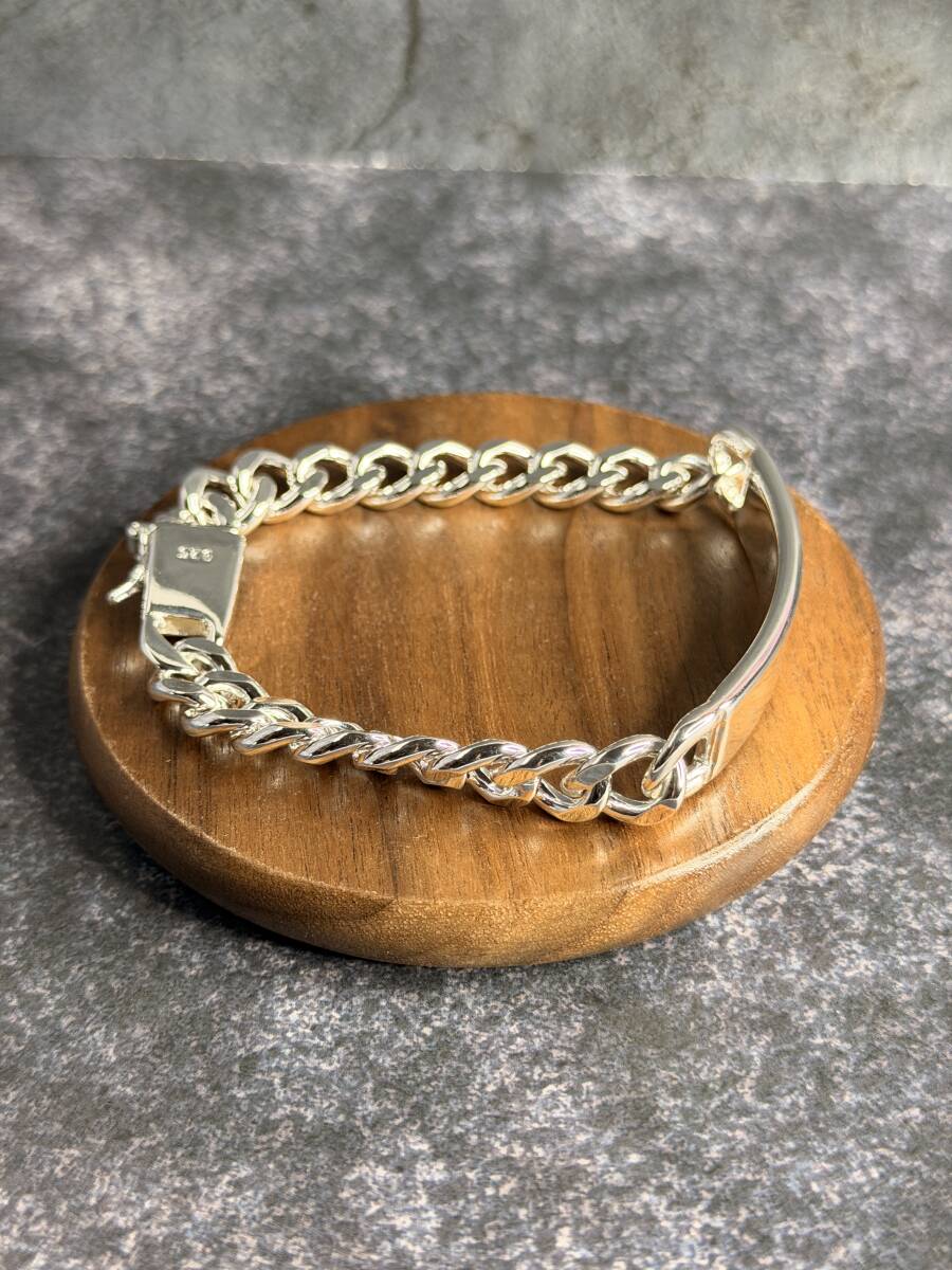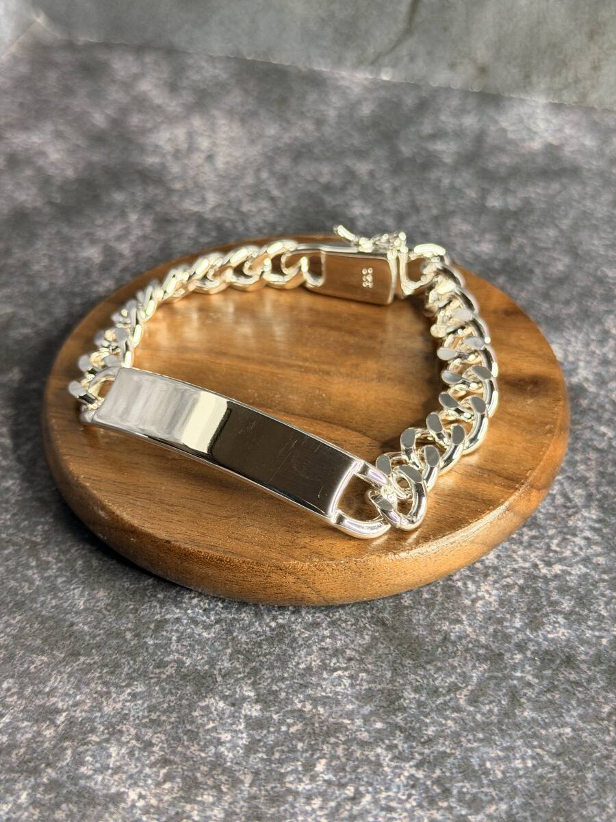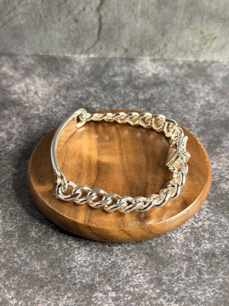 シンプルで高級感のあるIDプレートに、ほどよいボリュームの喜平チェーンを合わせたシルバーブレスレットです。
