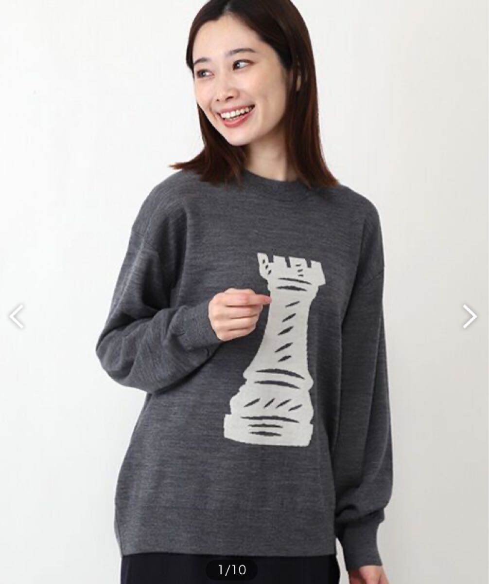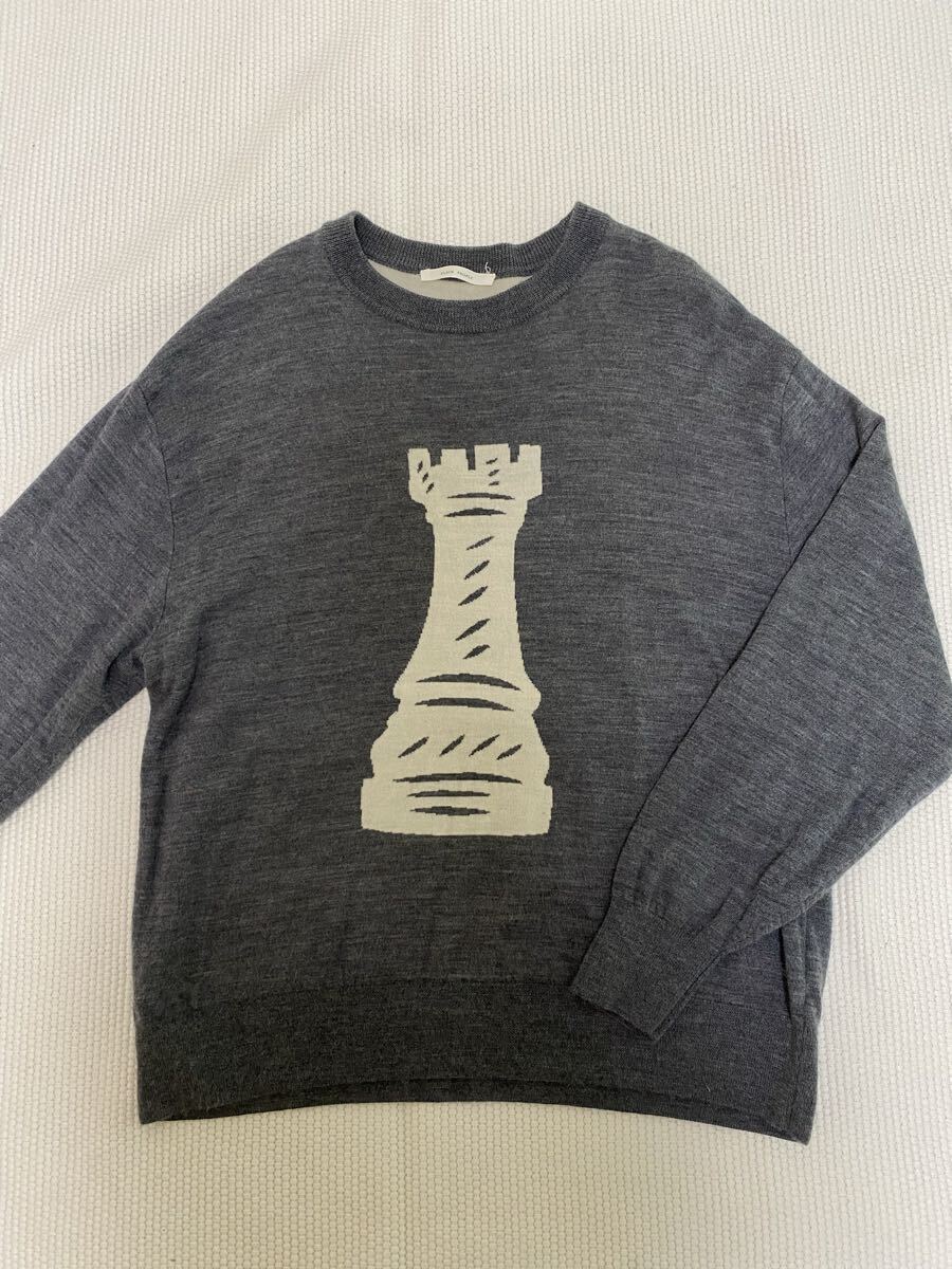 切り絵で表現したチェスの駒(ルーク・お城)を、大胆に落とし込んだジャガードのプルオーバー。グレー×ホワイトのトレーナーのような一見カジュアルな配色ですが、オーストラリア産の上質なウールを使用し上品な光沢感があります。