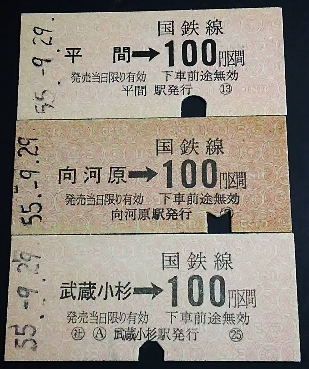 【硬券乗車券(B型/金額式)[大人専用]】 ★南武線(平間→100、向河原→100、武蔵小杉→100)3枚セット S55.9.29