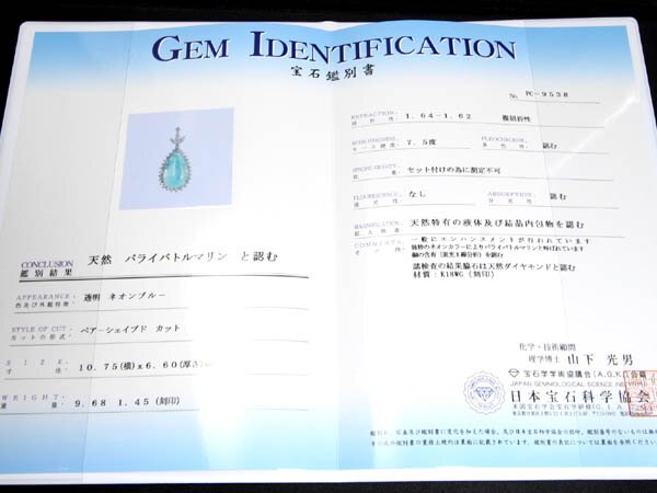 ◆安心の品質!!!【日本宝石科学協会】発行 宝石鑑別書付き!!! 豪華絢爛!!! 希少宝石 天然パライバトルマリン 超特大9.68ctと、極上ダイヤモンド 総計1.45ctを贅沢に宝飾した、超高級ペンダントヘッドをご紹介いたします!!! 数ある宝石の中でもトップクラスの資産価値を誇る宝石 天然パライバトルマリン!!! こちらは艶やかなテリと透明感が美しい上質なお石で、なんと9.68ctと超希少サイズ!!! 天然パライバトルマリンならではのネオンブルーの明るく力強い輝きを、超特大9.68ctもの圧倒的な存在感と共にご堪能いただける大変魅力的なお品でございます!!! こちら本当に高価で希少価値の高いお品です!!! 周囲には、1石1石が眩い煌めきを放つ極上ダイヤモンドを、総計1.45ctも贅沢に宝飾!!! 極上ダイヤ 総計1.45ctものボリューム溢れる輝きが、超特大の上質パライバトルマリンを一際華やかに輝かせます!!! 細部まで極上ダイヤをあしらったラグジュアリーなデザインには、高級素材K18WGを使用!!! ホワイトゴールドの質感が、より一層の高級感を演出します!!! 超希少!!! 上質パライバトルマリン 超特大9.68ct&極上ダイヤモンド 総計1.45ct輝く超高級ペンダントヘッド!!! 装いを華やかにクラスアップしてくれるラグジュアリーな特級品ジュエリー!!! こちら格安での出品となっておりますので、この機会是非お見逃しなく!!! ◆こちらの商品はお客様の希望がある場合のみ、評価をつけております。 評価希望のお客様は、オーダーフォームの要望欄にてお知らせくださいませ。 ◆パライバトルマリンには、ルーペ顕微鏡レベルで確認できる、天然のインクルージョンからなるミクロのカケがございますが、肉眼で気になるレベルではございません。 |