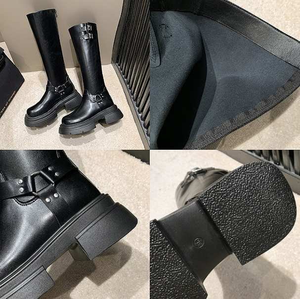 レディース 靴 ブーツ ロング ラウンドトゥ レザー調 厚底 脚長 スタイルアップ 黒 ブラウン 22.0cm(34) ブラウン