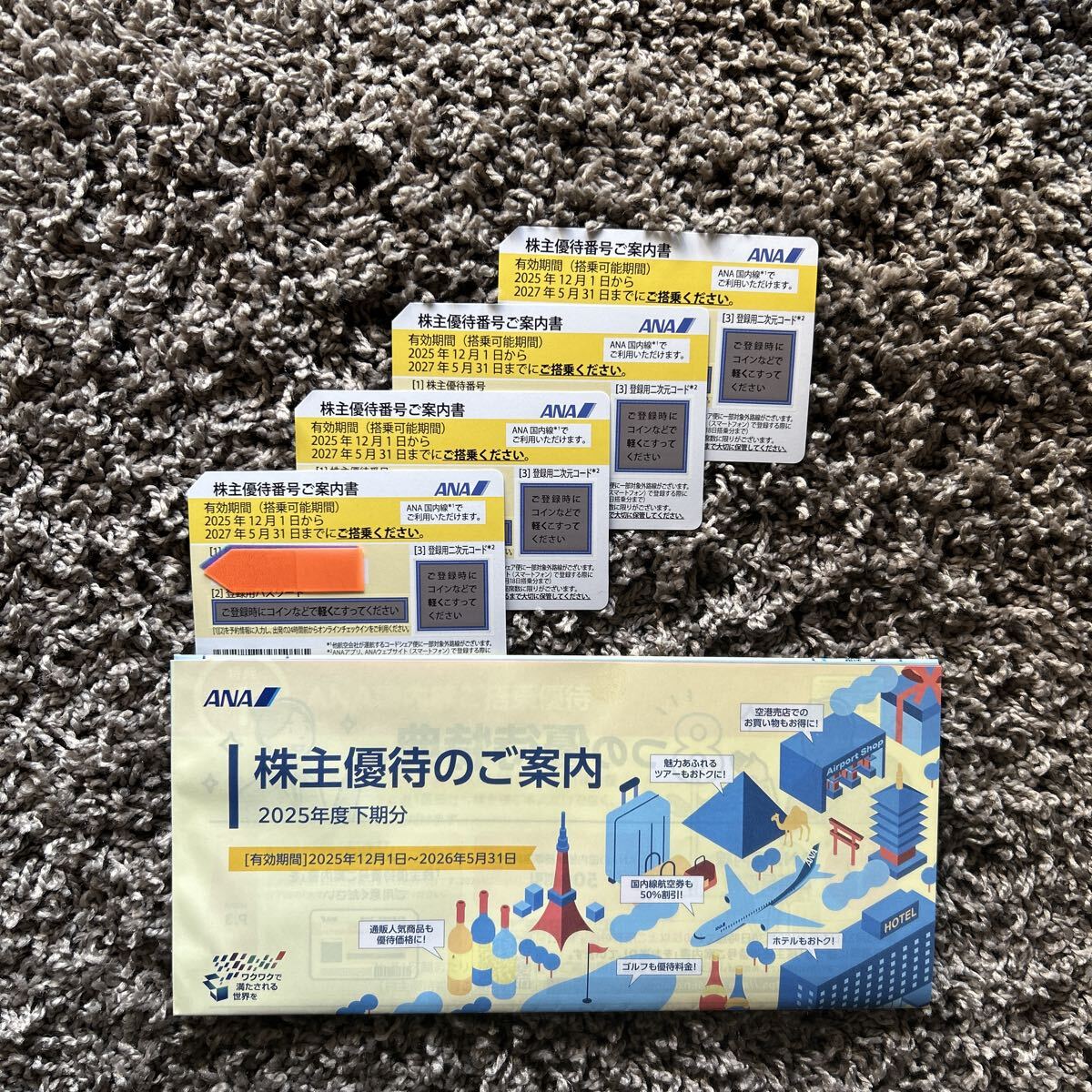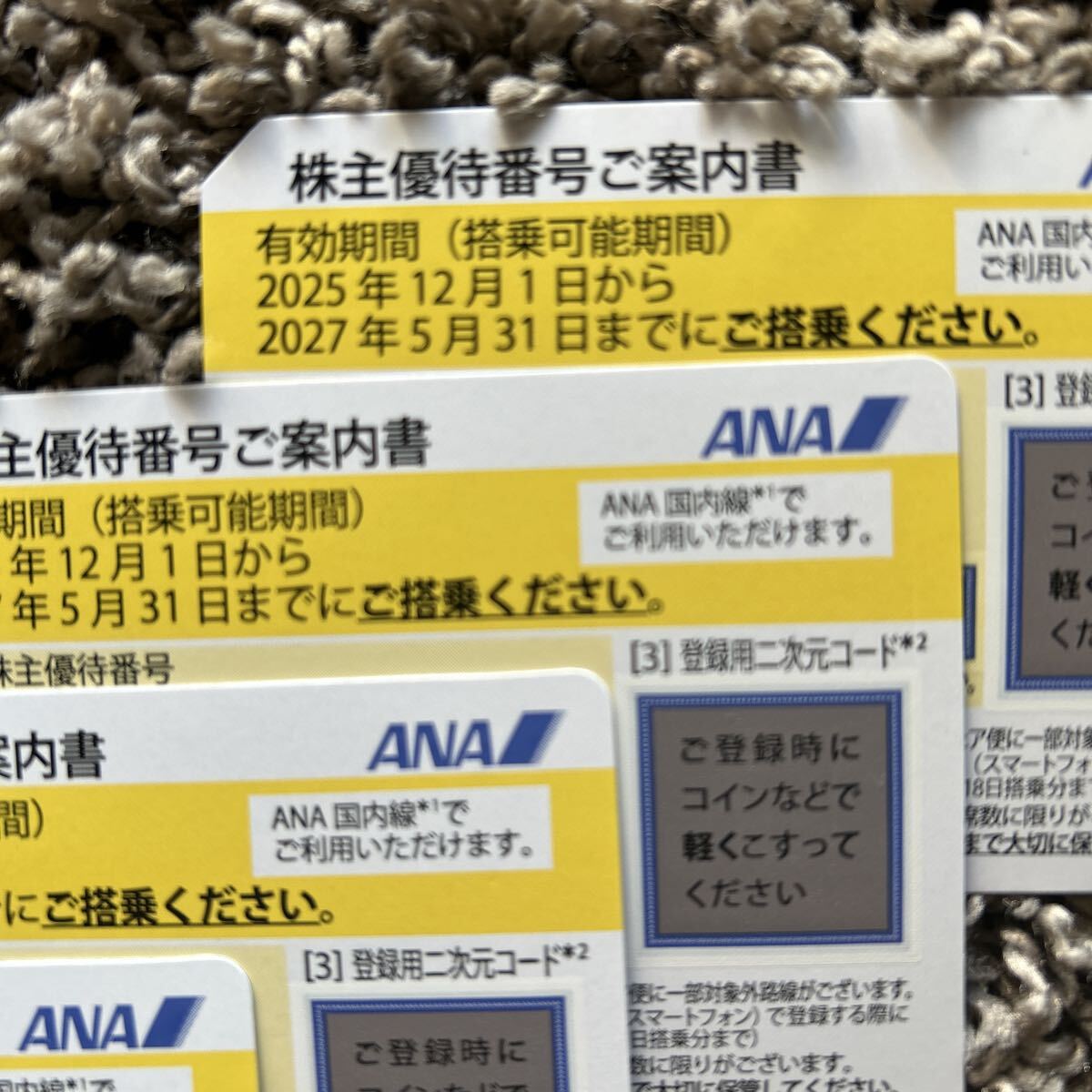 全日本航空優待券:有効期間2025年12月1日〜2027年5月1日迄4枚1組です。