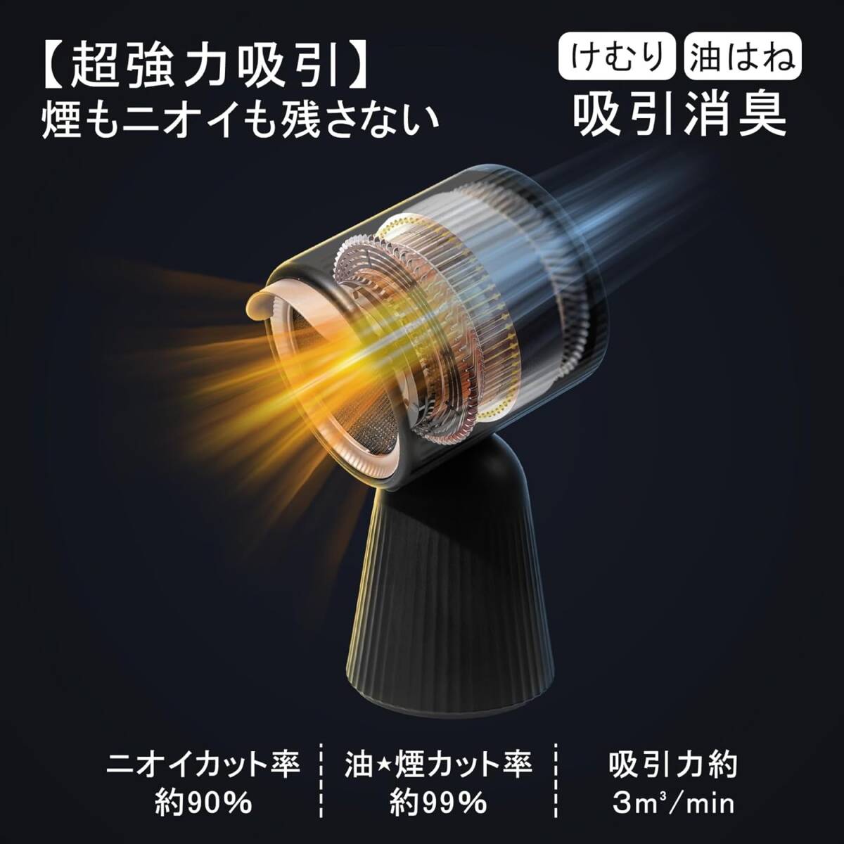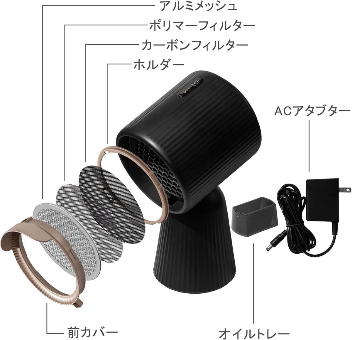 • パッケージ内容:卓上レンジフード本体、ACアタブター、日本語取扱説明書、交換用のポリマーフィルターが5枚、カーボンフィルター6枚