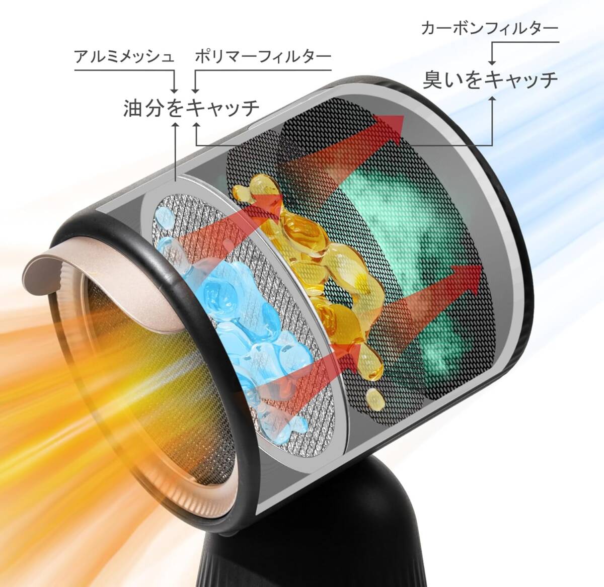 • 【卓上換気扇】卓上で「油」「煙」「ニオイ」「湯気」を直接とれるから、部屋に広がらない!空気清浄機では取れないような油も、これ一つで除去できます。(ニオイのカット率約85%、油のカット率:99%)航空機器に使われるアルミメッシュと、微小なポリマーフィルターの立体構造により汚れた空気をろ過、室内空気を快適に保ちます。