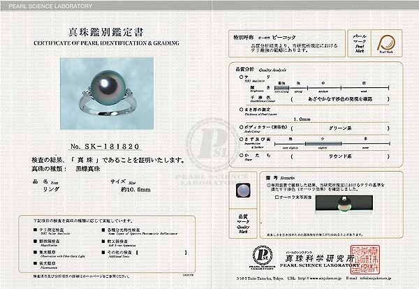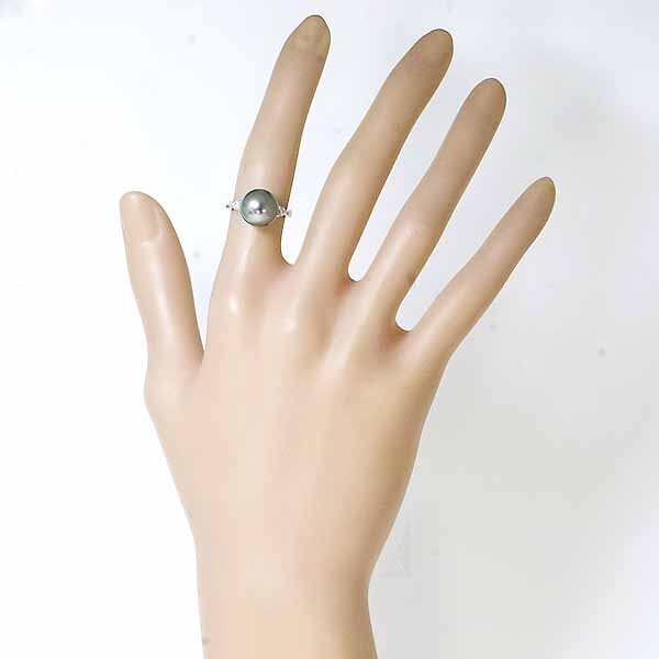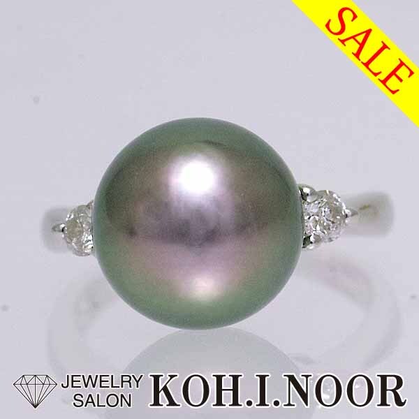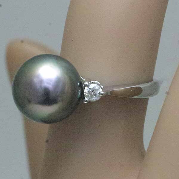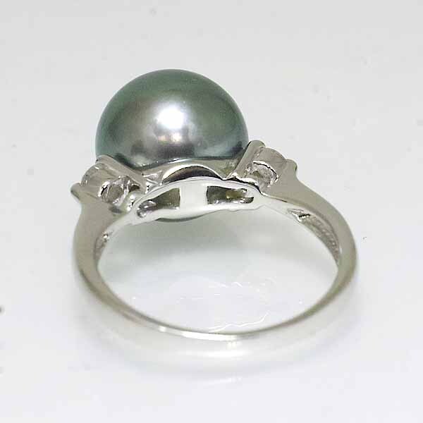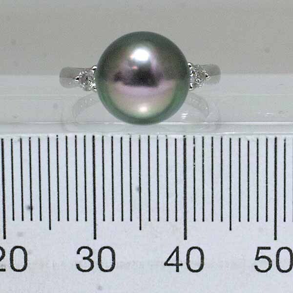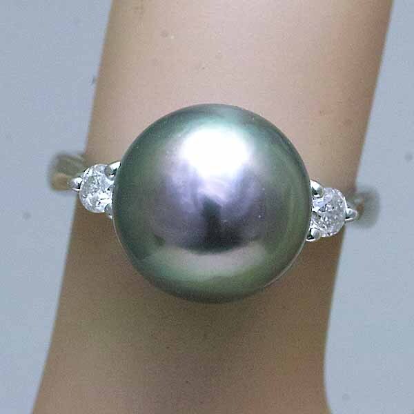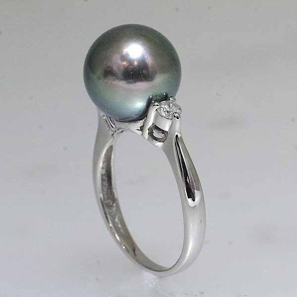 オーロラピーコックの黒蝶真珠にダイヤを添えたプラチナ製のファッションリング。