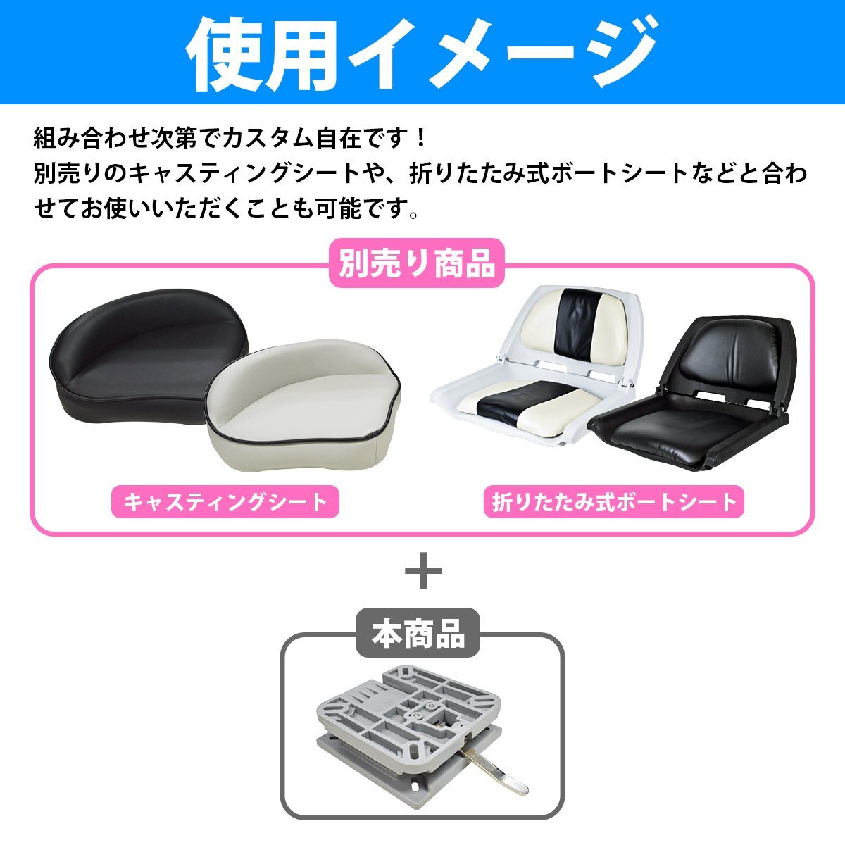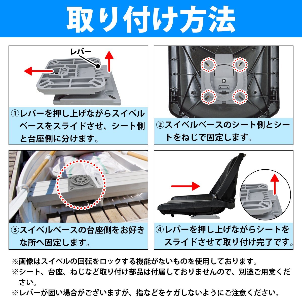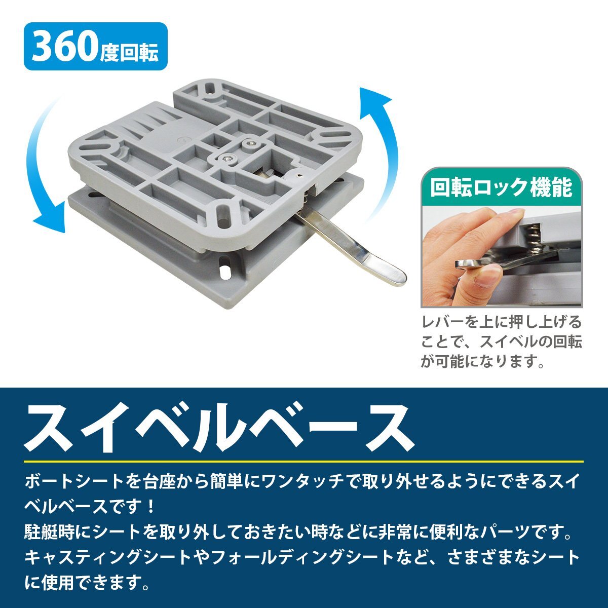 ボートシートが台座から簡単に取り外せるスイベルベースです。