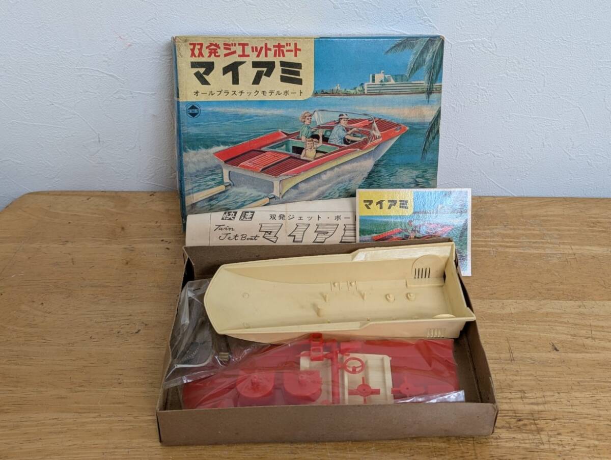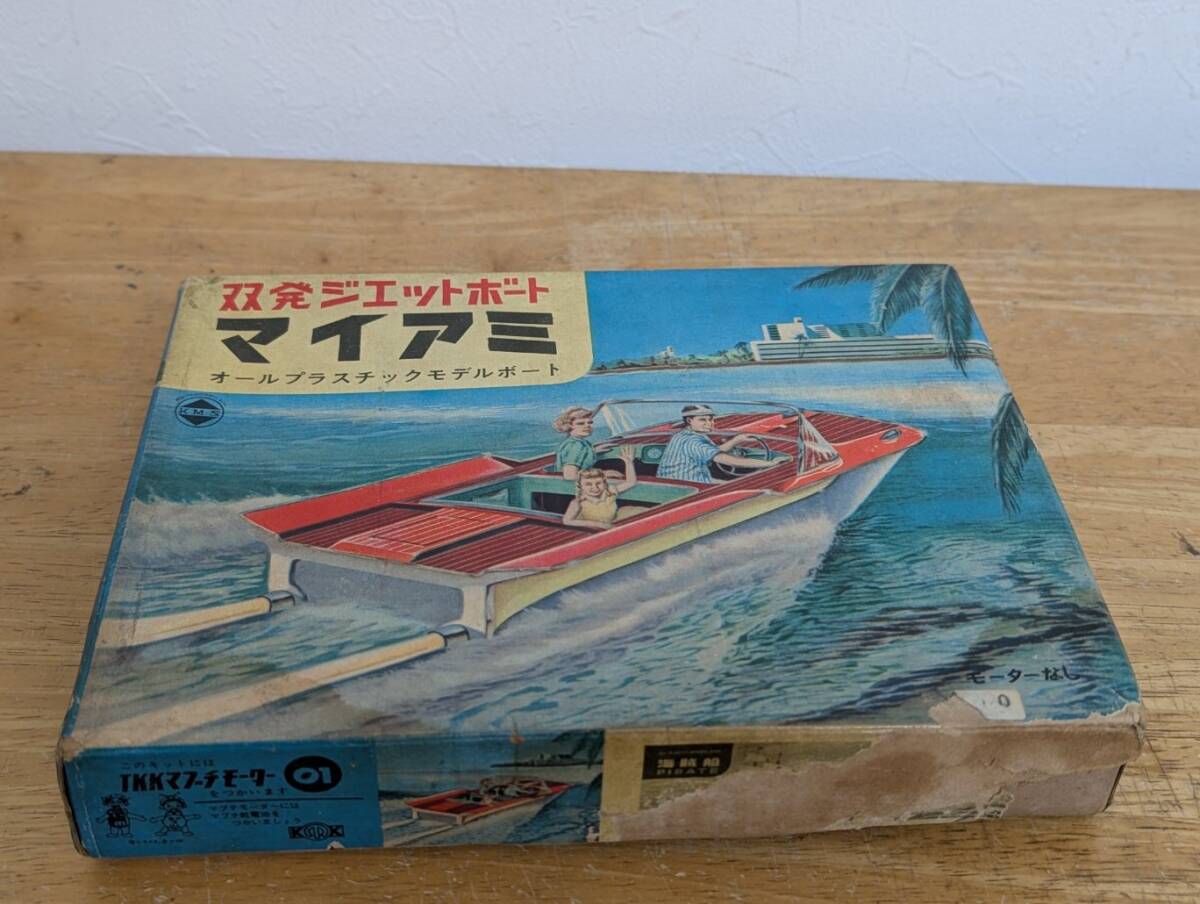 旧コグレ(約20cm KMSロゴ)双発ジェットボ―ト マイアミ モ―タ―ライズです。箱は汚れ、壊れ、剥がれがあります。袋部品未開封です。コグレがプラモ参入した当初の古いキットです。スクリューでなくジェット噴射(ボディ内に水を取込みプラペラにより水を噴射)による推進力で走るユニ―クなキットです。箱絵が味があります。欠品があってもご容赦下さい。興味ある方いかがですか。
