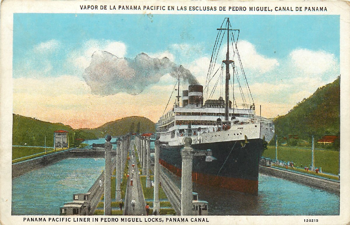b-4792【絵葉書】◆外国製 パナマ運河のペドロ・ミゲル閘門にいるパナマ・パシフィックの汽船