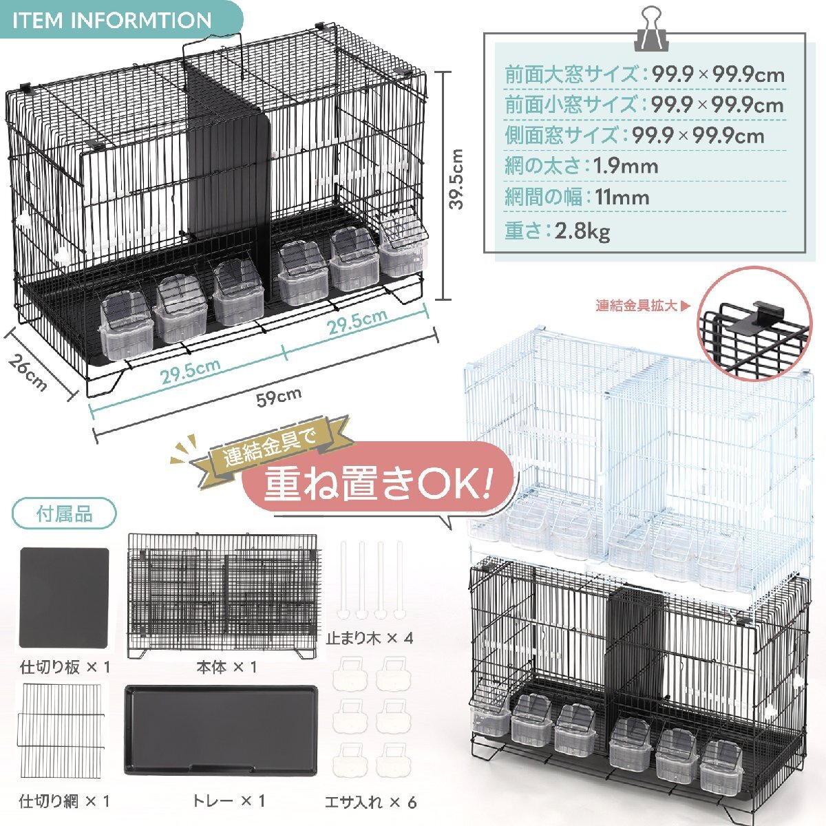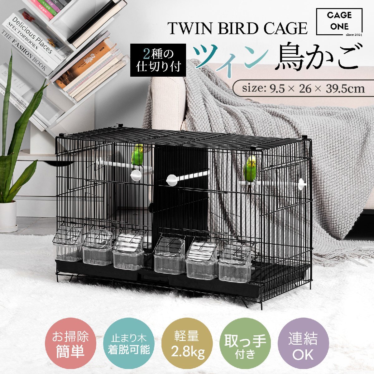 2部屋 ツイン鳥かご スクエアタイプ 鳥小屋 鳥カゴ 鳥 ゲージ ケージ バードケージ セキセイインコ ※商品のカラーは最初の画像のものとなります。 ※付属物は商品仕様に記載されているもののみとなります。 1つの鳥かごが仕切りで左右に区分けされたタイプの鳥かごとなっております。 仕切りは取り外し可能なため、1つの鳥かごとしてもご使用いただけます。 底網付きで、底は引き出し式のため掃除がカンタン。 2部屋あるためカナリヤやセキセイインコなどの小鳥の多数飼育でも広々。 鳥かごを上に重ねることで省スペースで複数の飼育も可能です。 サイズ(約): 幅59.5×奥行き26×高さ39.5cm ●付属品 鳥かご本体(スチール製)、底はプラスチック(底網つき) 止まり木:4本 プラスチック製のエサ(水)入れ:6個 ※輸入品 海外品により取り扱い説明書は付属はしておりません。 またメーカー品ではない為、取り扱いについてのサポートはできません。 |
