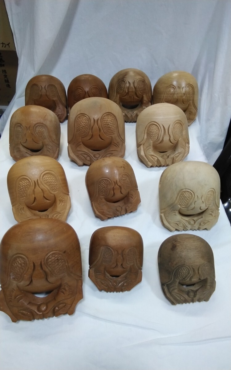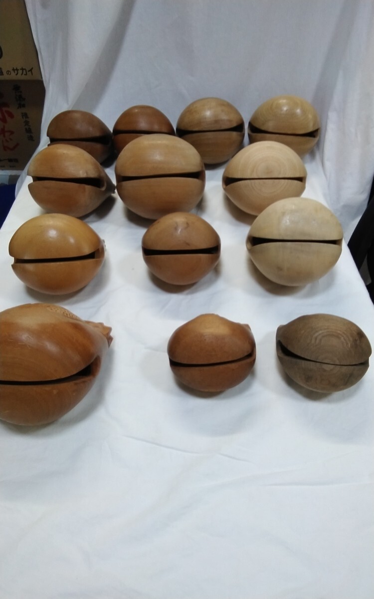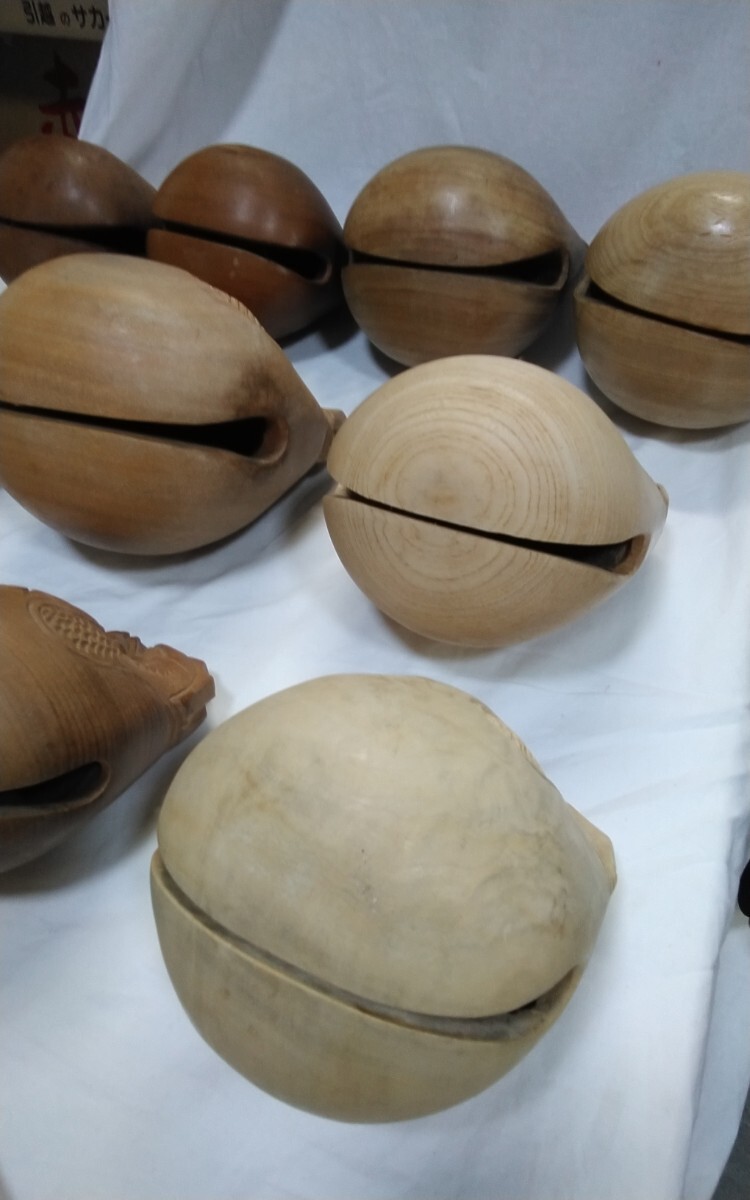 白木の木魚、現状中古まとめ売りです。大きめのものから握り拳大の小さいものまで合わせて13点です。銘入りのものもありました(画像4)バチ・座布団などは付属いたしませんのでご了承願います。