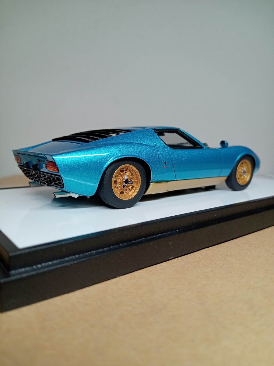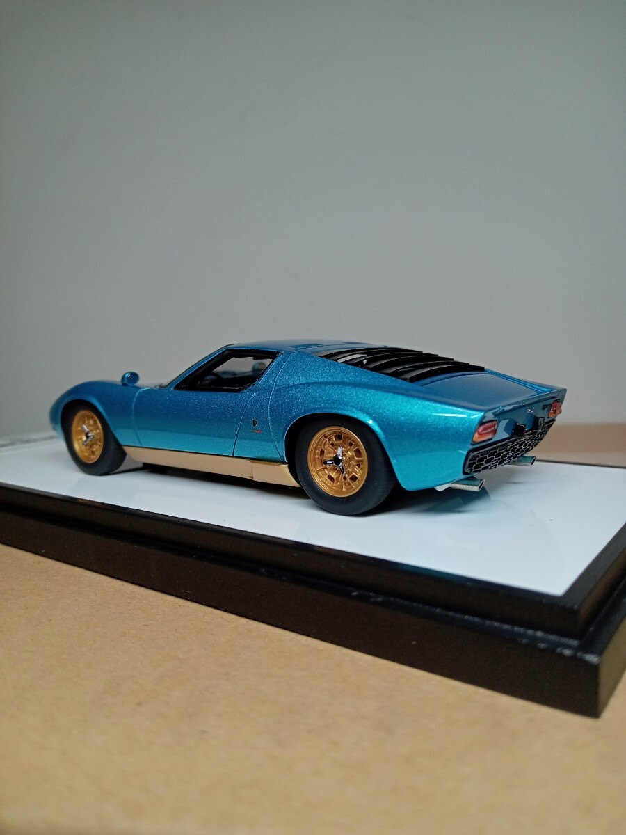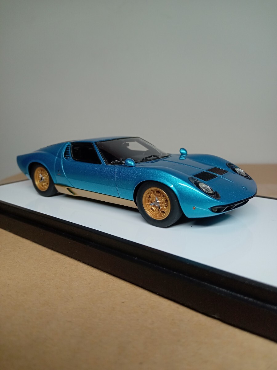 とても美しいメタリックのアルテミスグリーンの外観にゴールドのホイールがめちゃくちゃ格好良い仕上がりのモデルです、またリヤのルーバーの隙間から精密なエンジンが見えます、人気の初期モデルのP400のミウラですので、ランボルギーニファンの方に是非ともコレクションに加えて頂けたらと思います。