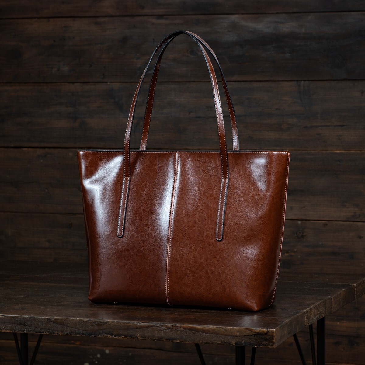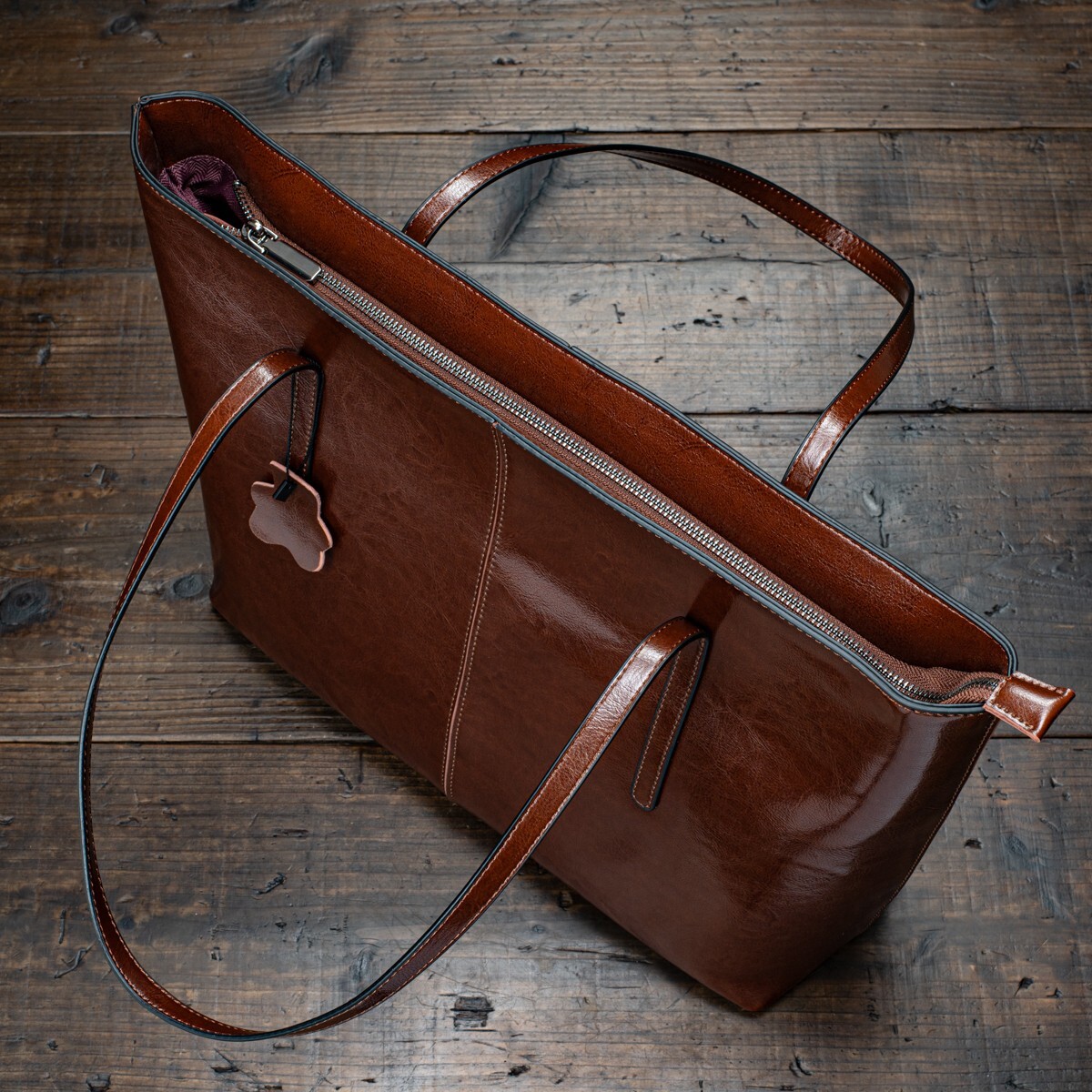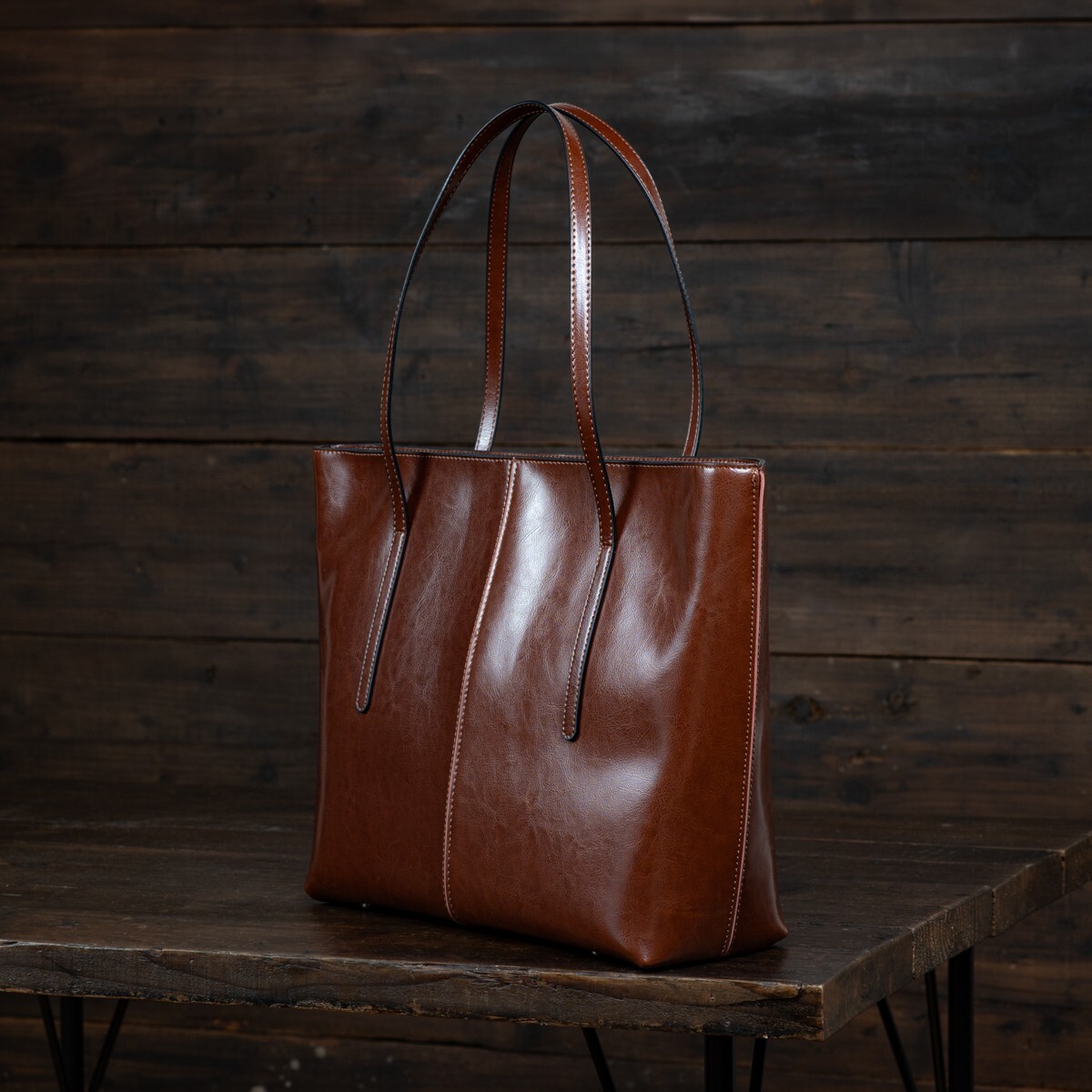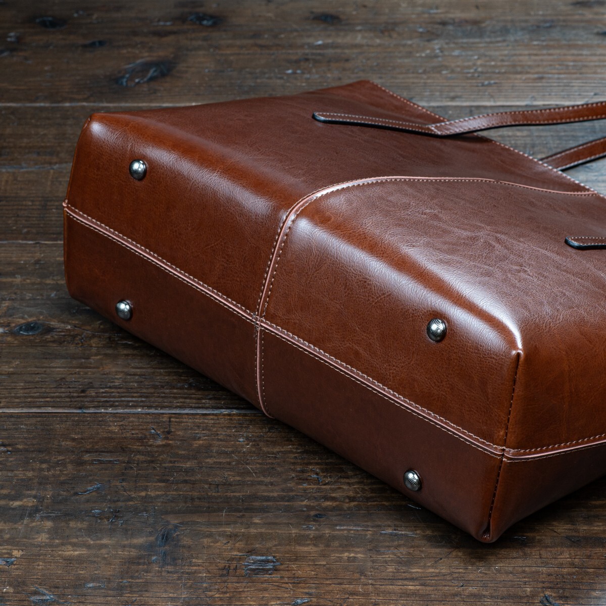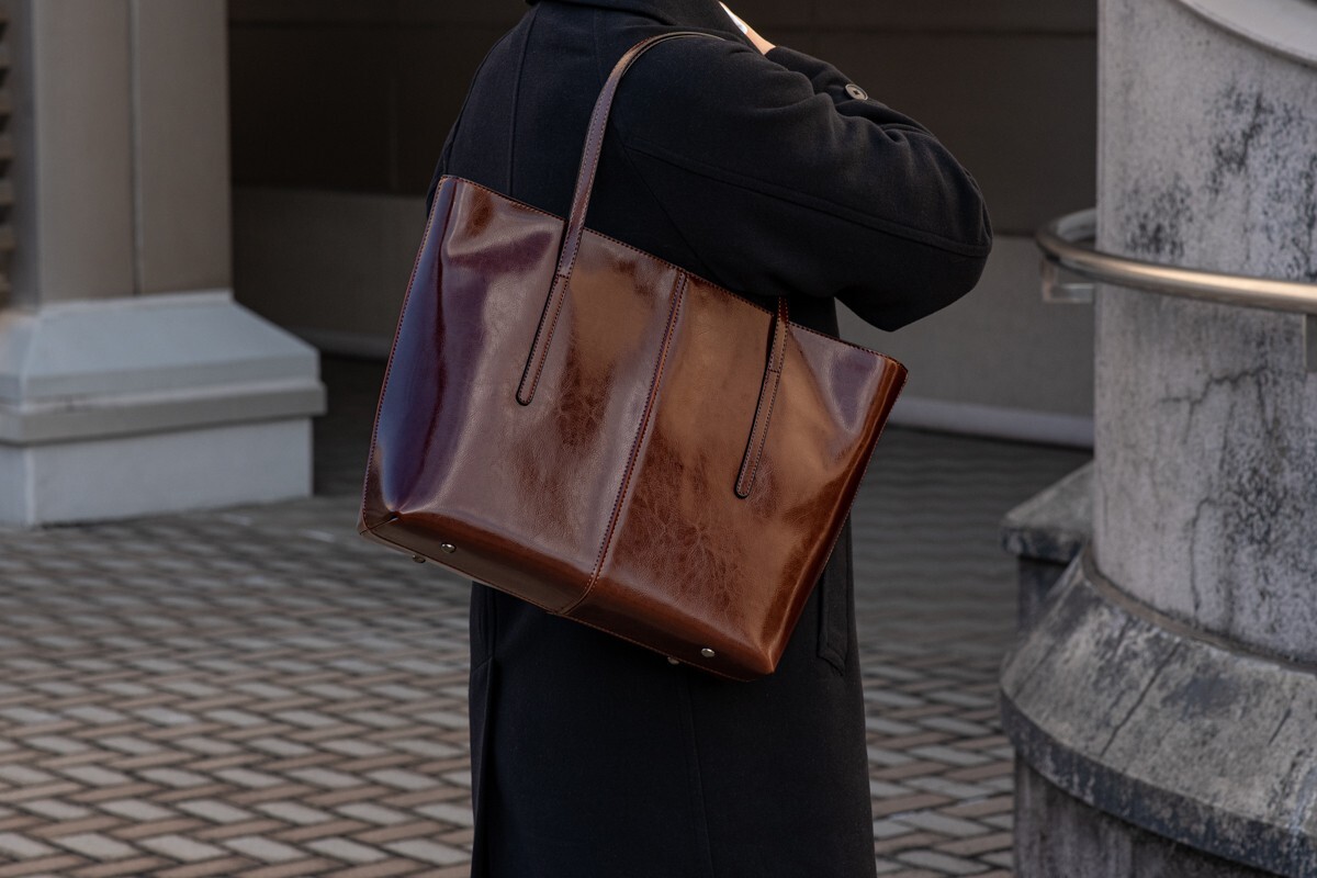 革本来のシボが入ることで落ち着いた風合いの出た、本革製のメンズトートバッグです。ハリのある本革を使用しているため、しっかり自立します。底面には鉄鋲が付いており、床に置いても本体が傷つきません。