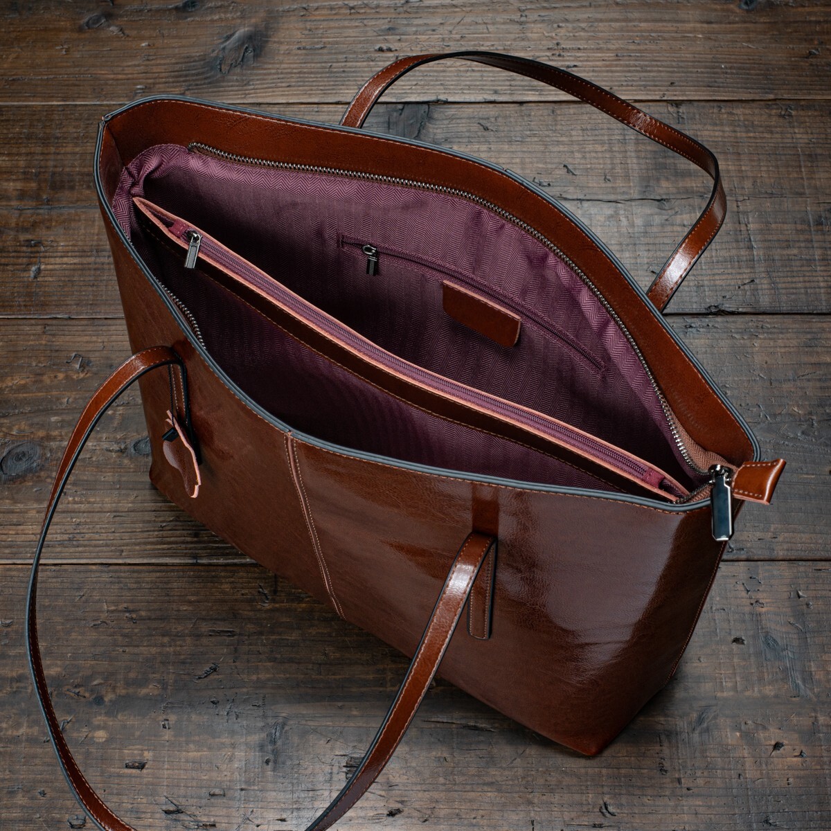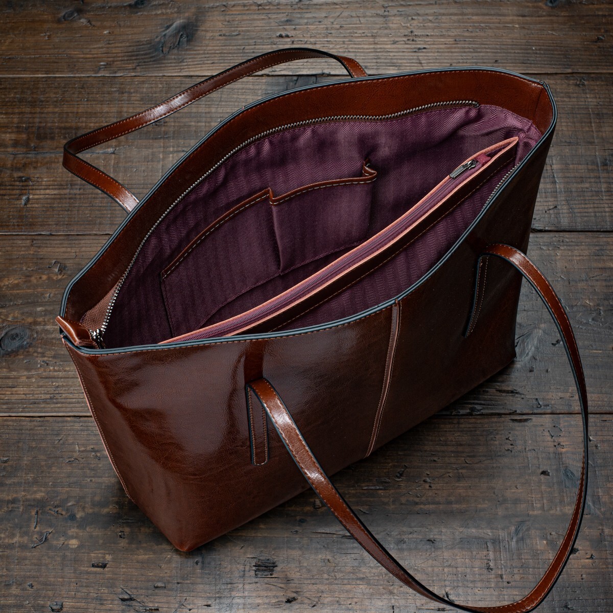 内側の側面にはファスナー付きポケットがあり、貴重品の収納に便利です。また、オープンポケットも備えているため、小物の整頓にも便利です。