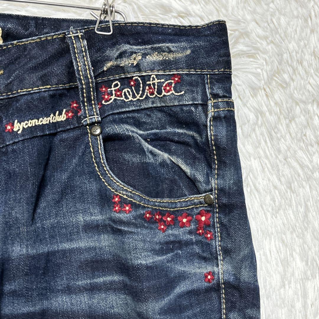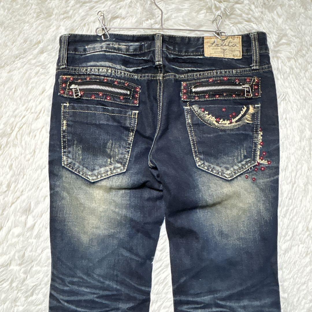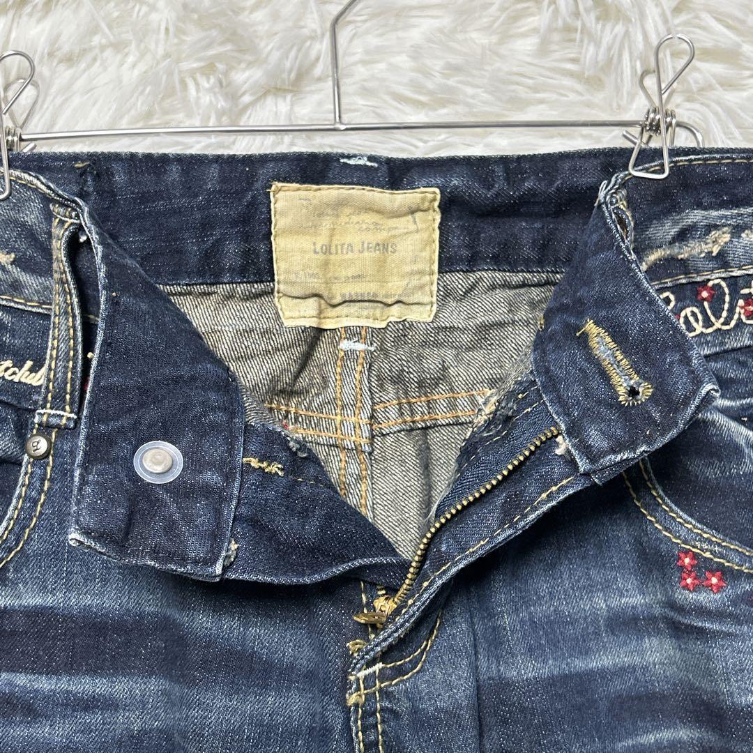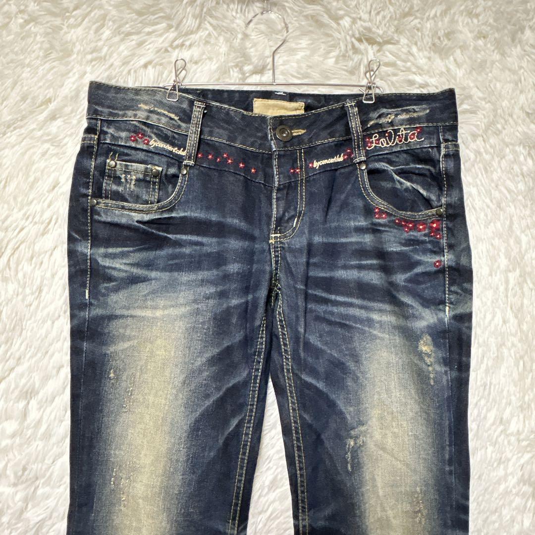ロリータ デニム ローライズ 32 ストレート 花柄刺繍 F y2k 大きめ 0DE185