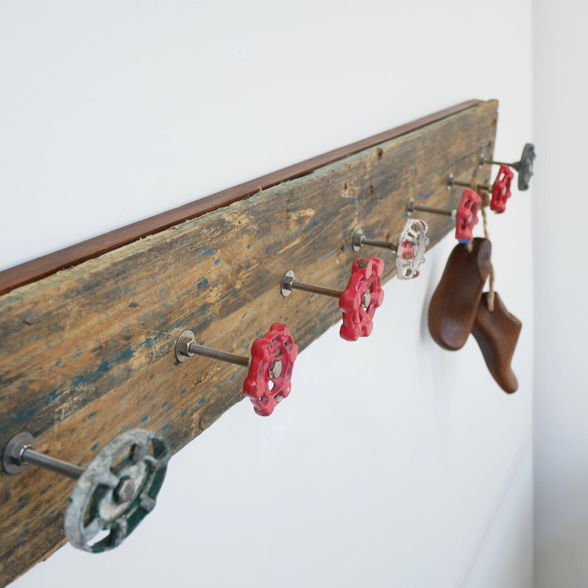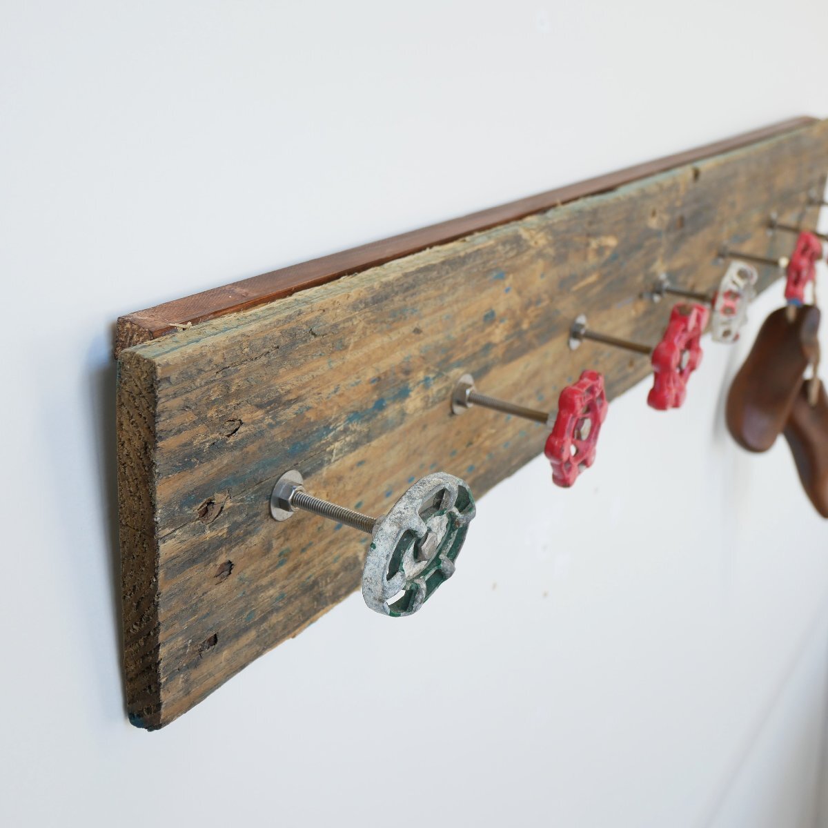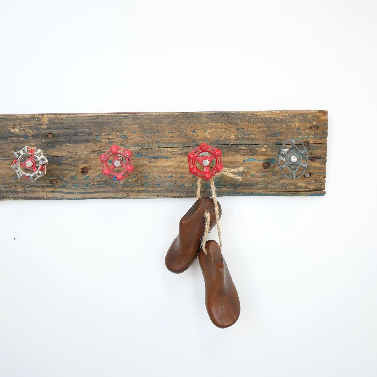 | 商品説明 explanation | 古材にバルブハンドルを取り付けて壁掛けフックにしたモノです。 フック7本はメタル製です。 ※靴の木型は対象外です。 お洒落なアイテムを、お店のディスプレイ小物などにいかがでしょうか。 |