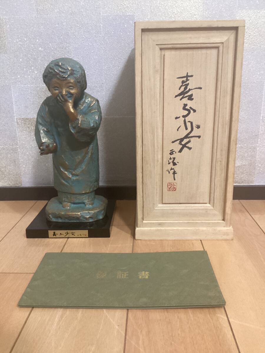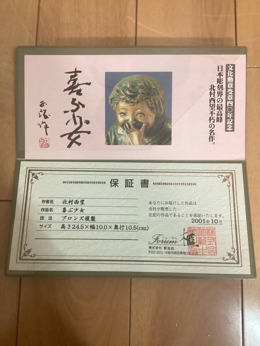ご覧いただきましてまことにありがとうございます。文化勲章 北村西望作 (喜ぶ少女)の出品です。共箱 保証書 台 完璧に揃っております。詳しくは画像にてご確認ください。送料佐川急便2000円