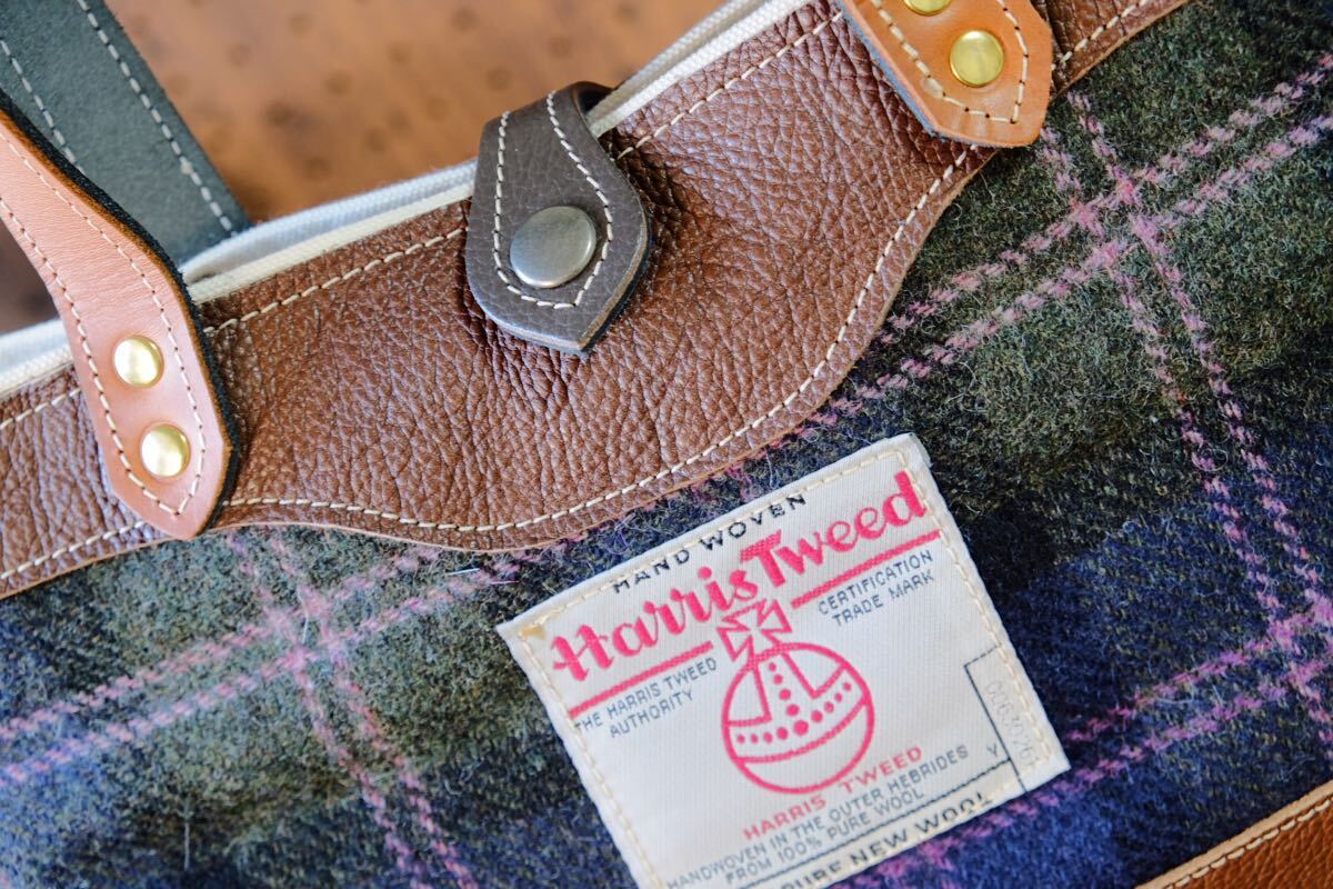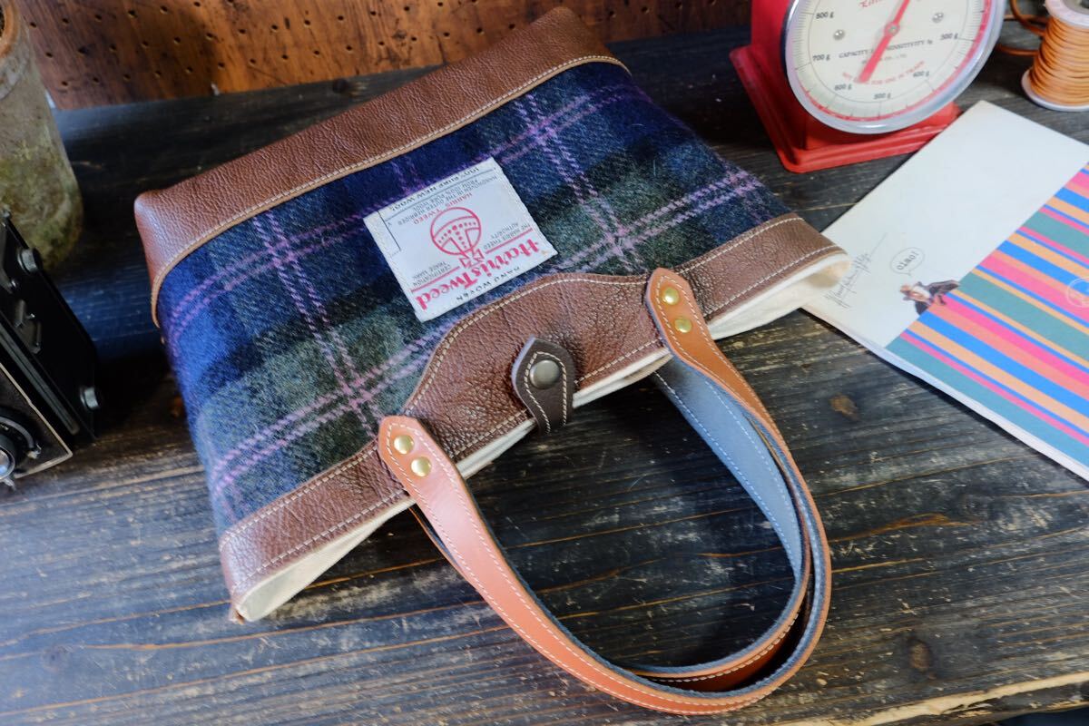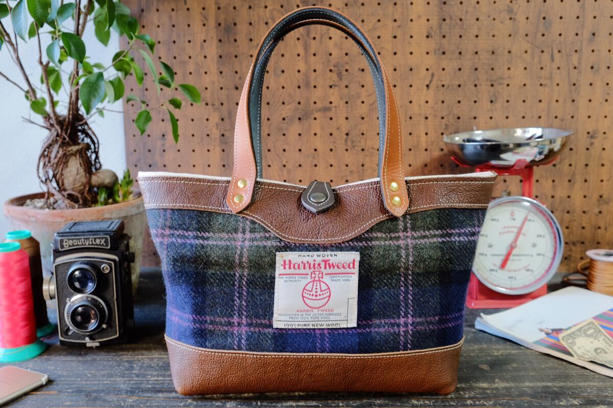 ◆ハリスツイードとダコタシュリンク牛革トートバッグ ブラウン日本製帆布ハンドメイド秋冬harristweed