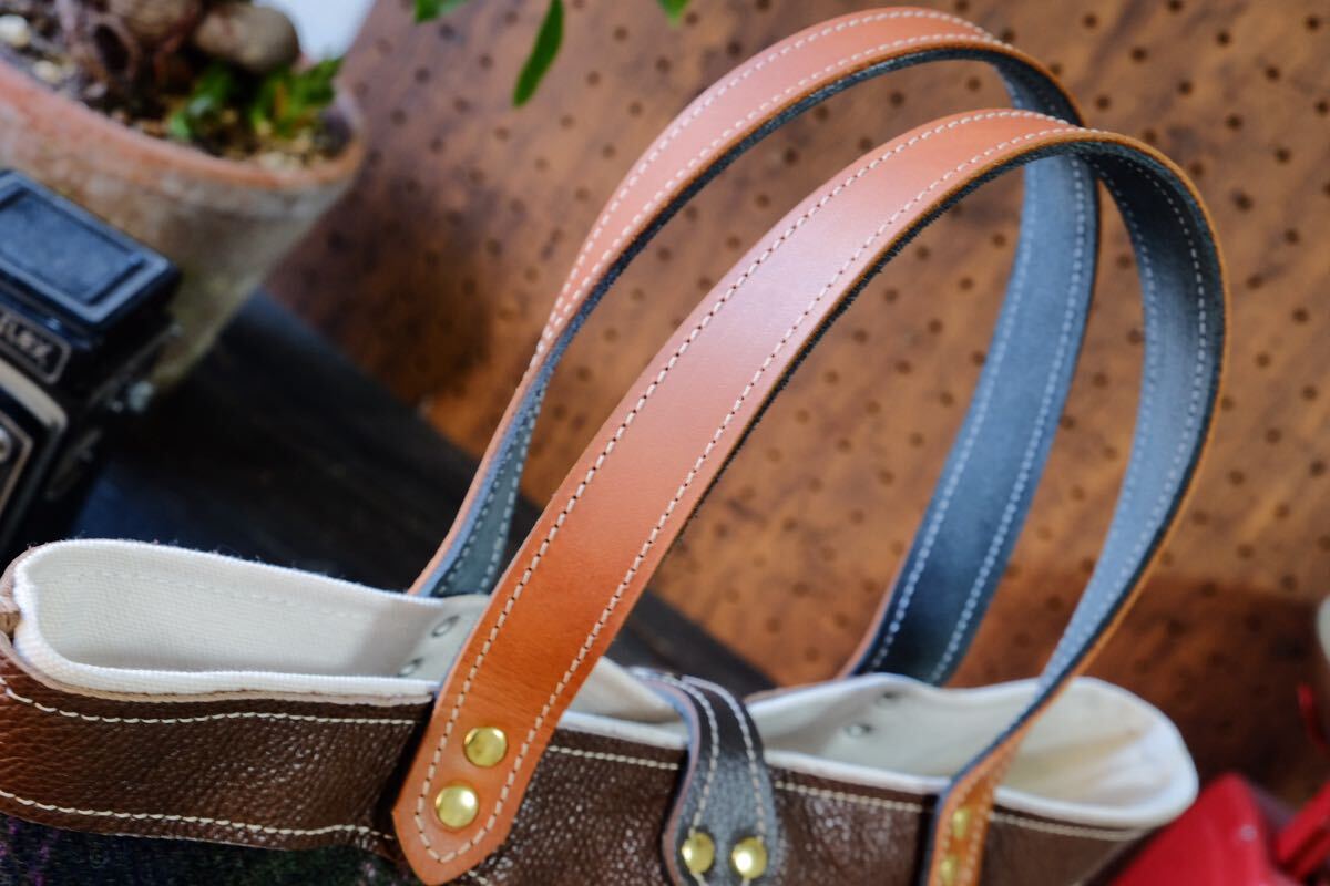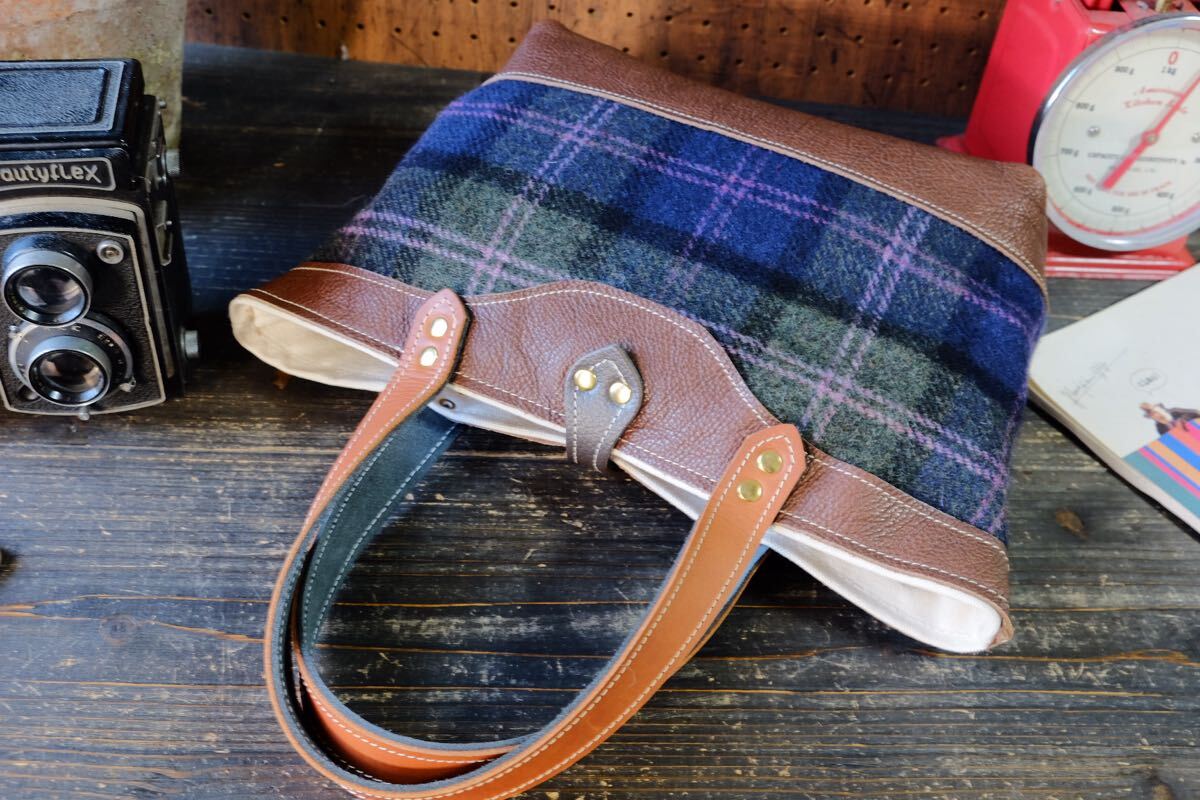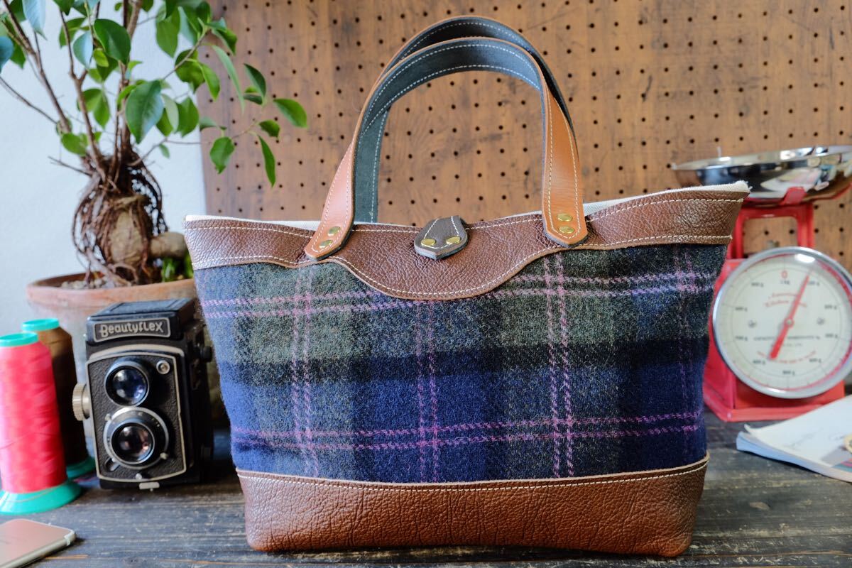 ダコタシュリンクヌメ牛革と秋冬の差し色にぴったりのツイード生地など中心に使用し両面表で楽しめるデザインに仕立てました。 裏地は丈夫な帆布でお創りしておりますので、耐久性とバッグとしての総合的な軽さを可能にしております。 タンニンなめしの高級革で柔らかく経年変化をお楽しみ頂けるバッグです。