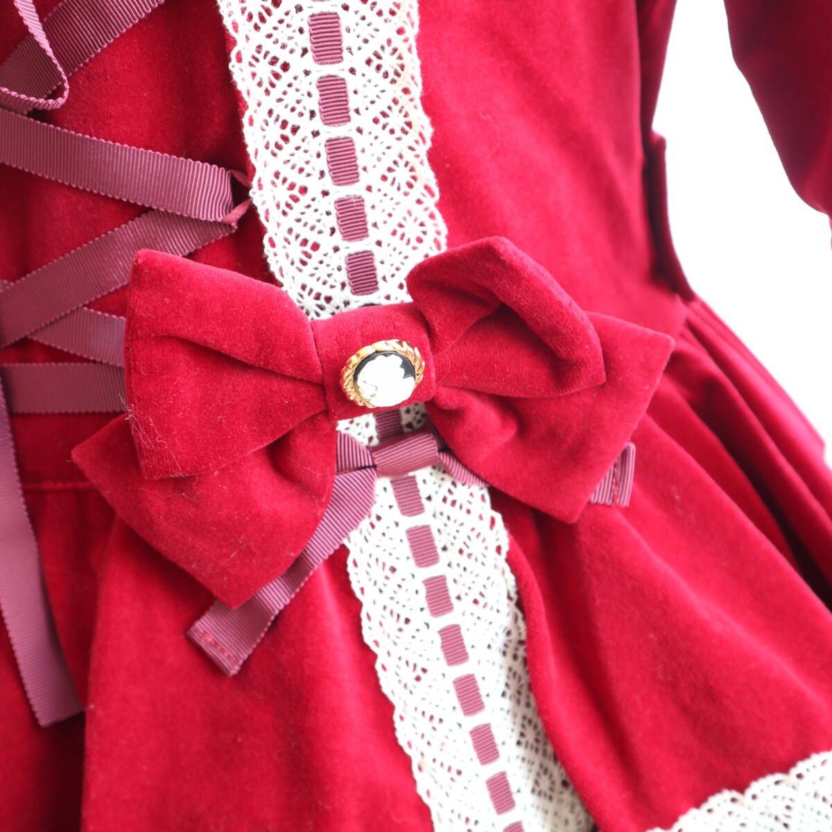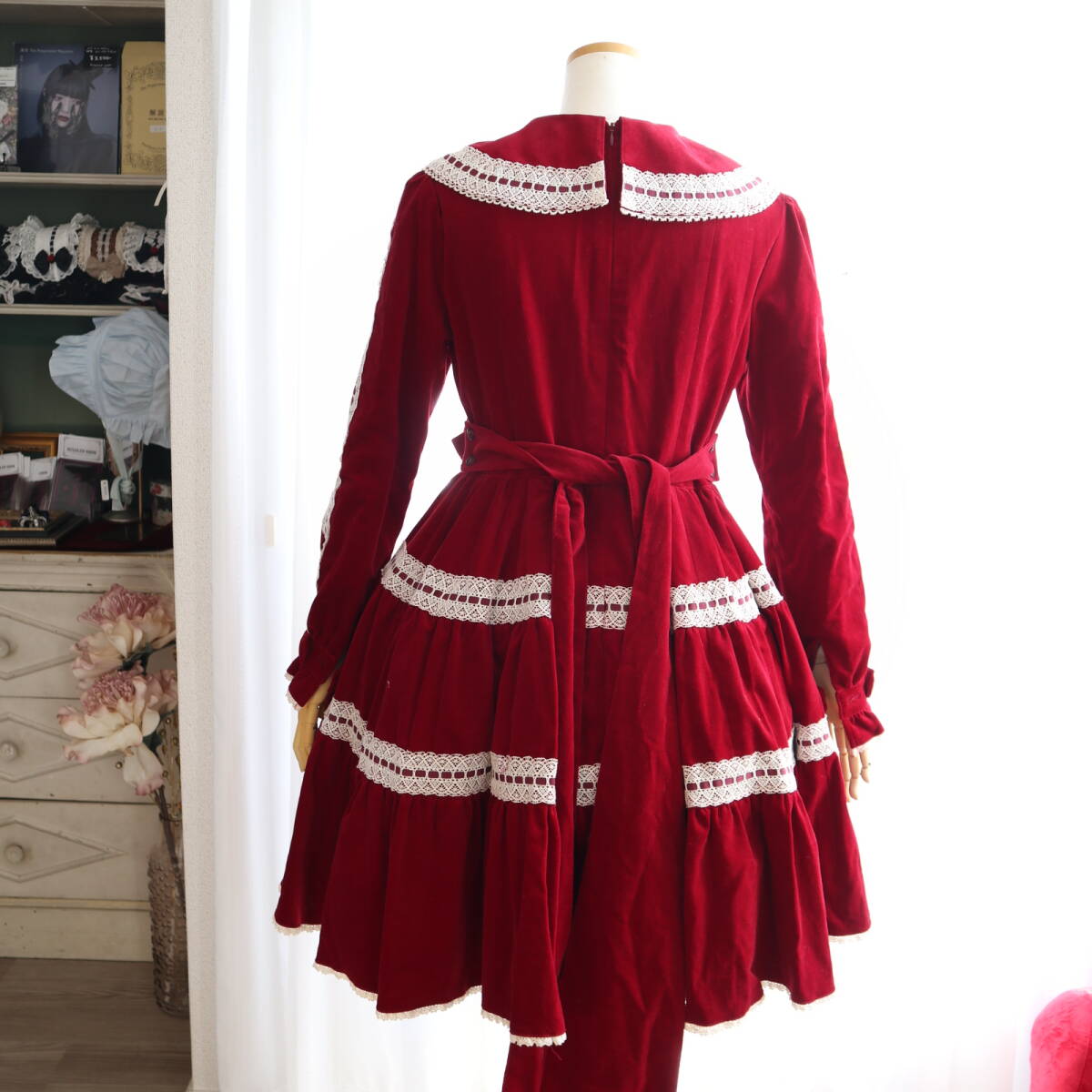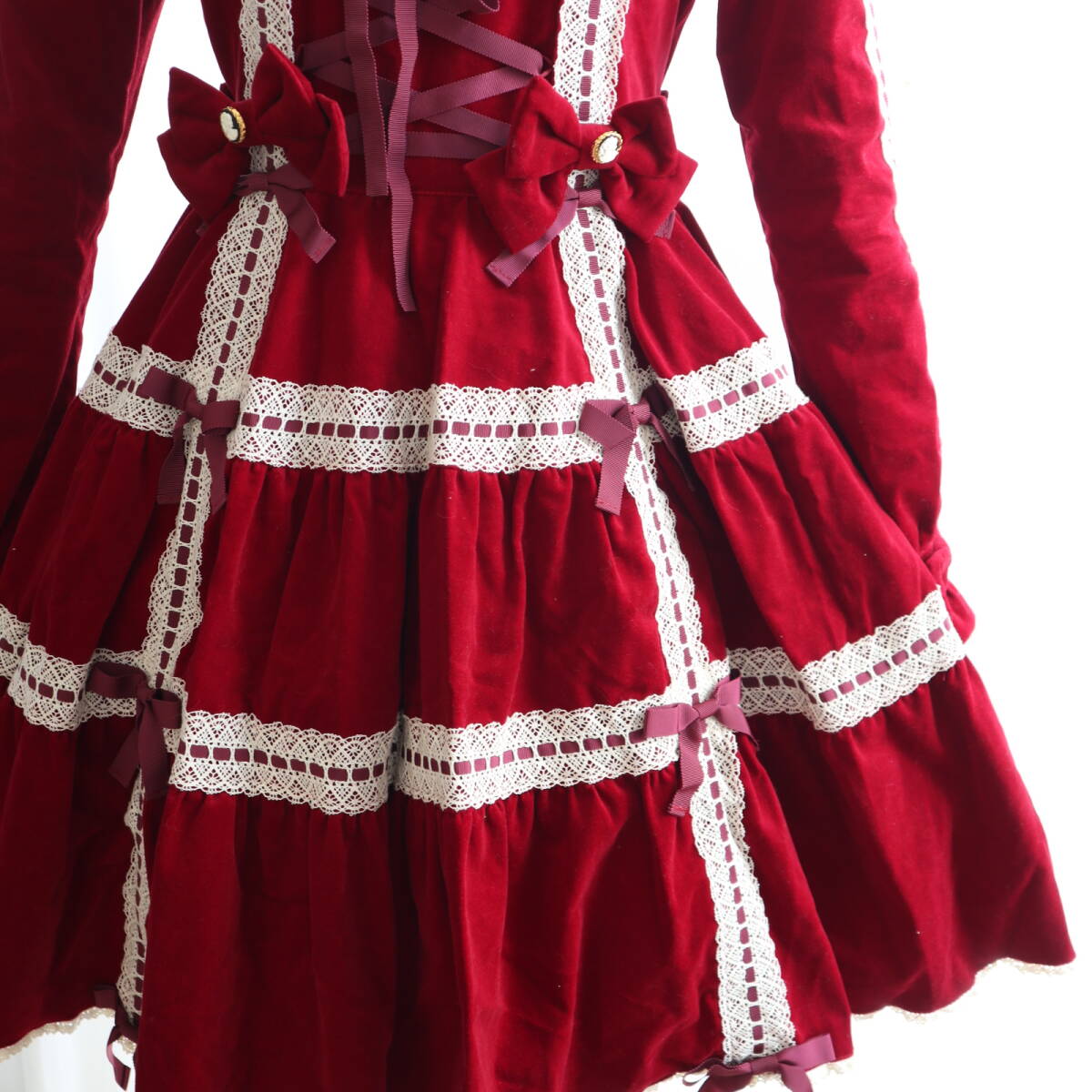 metamorphose temps de fille◆別珍 ティアード ワンピース リボンヘッドドレス セット/ロリィタ ゴスロリ メタモルフォーゼ 赤 ボルドー