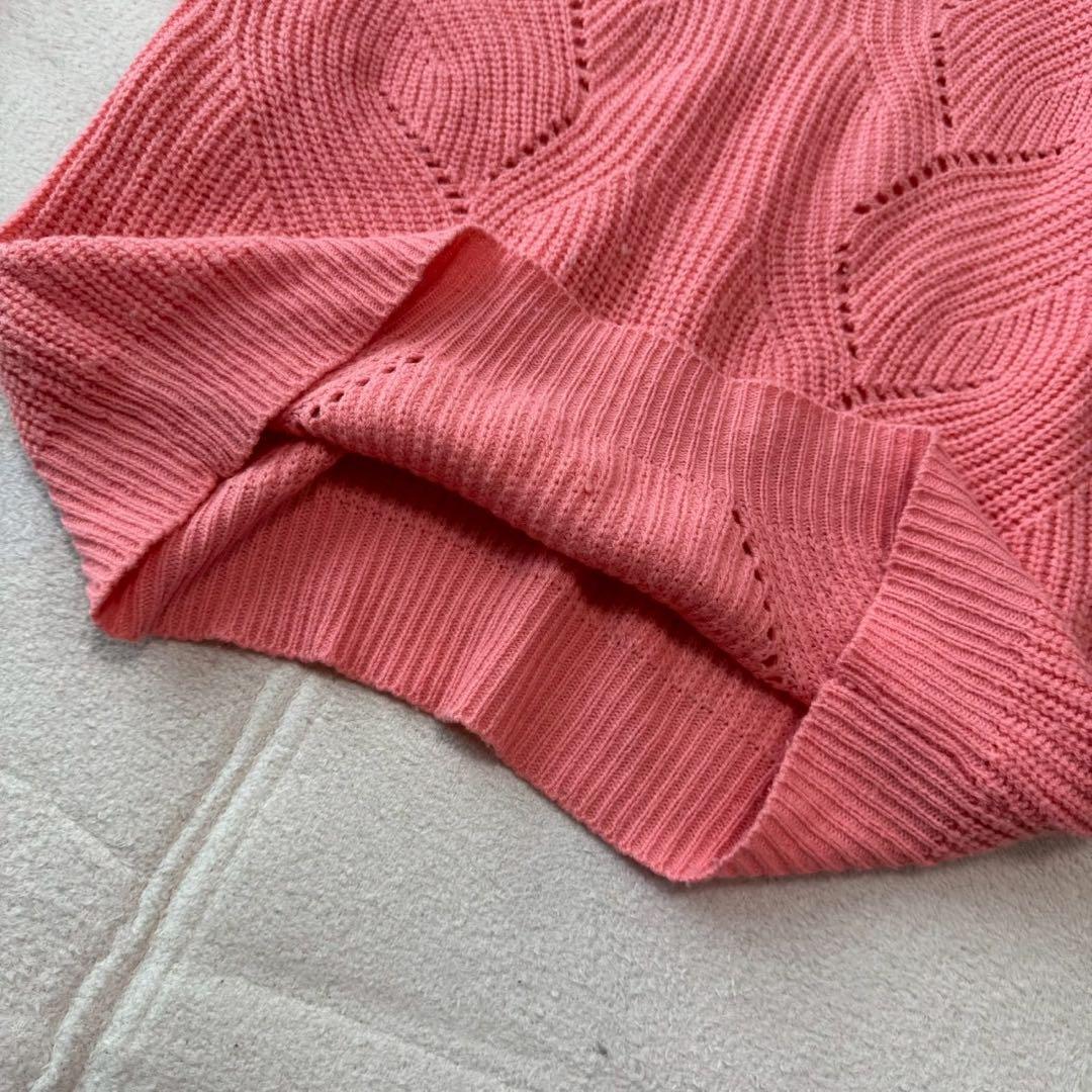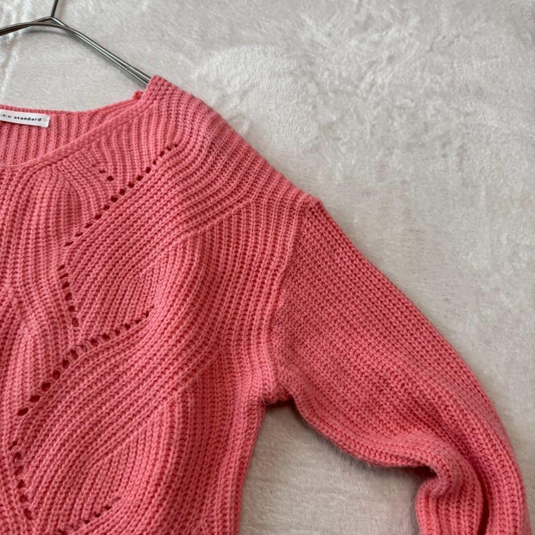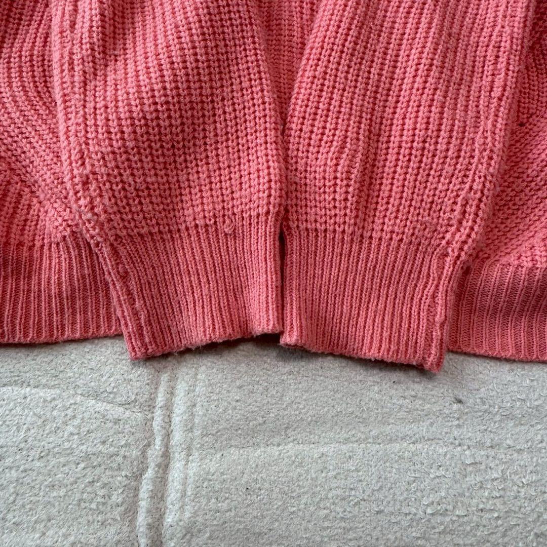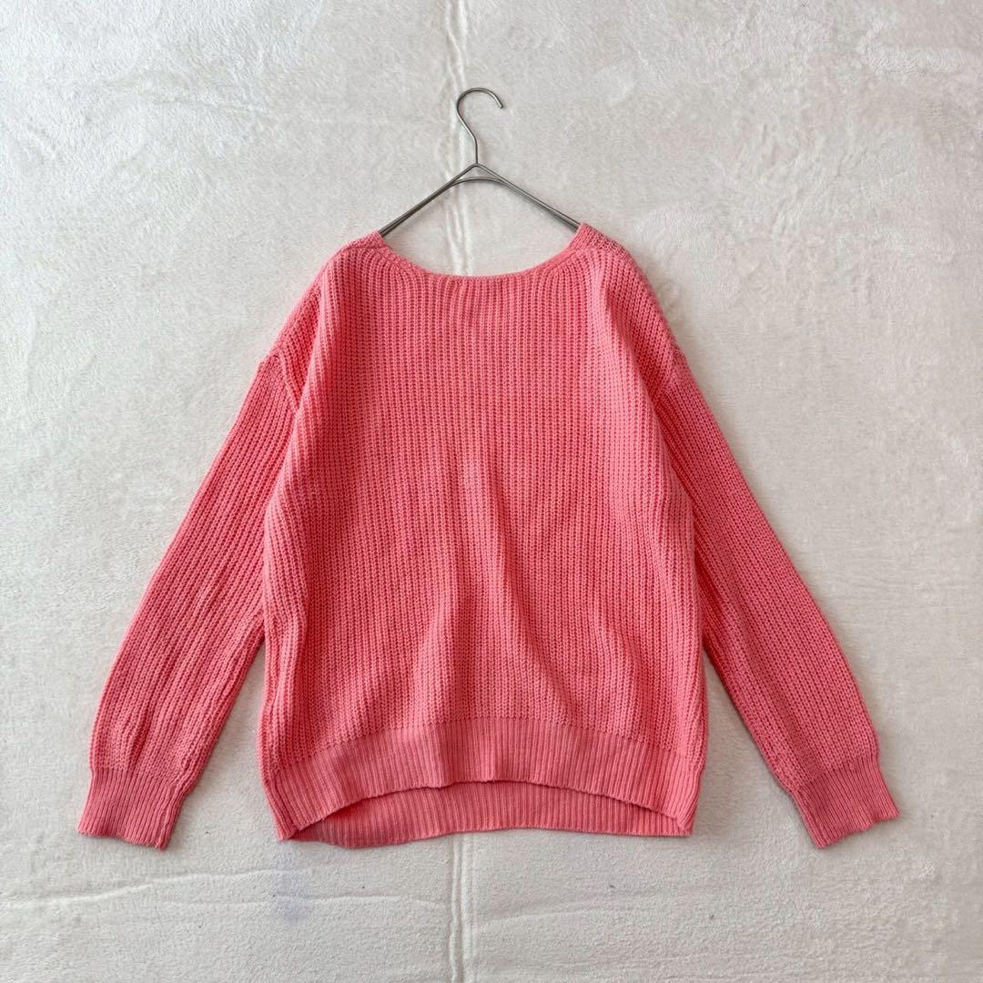 編み模様が特徴的なピンクのVネックセーター、ゆったりとしたフィット感で快適な着心地。