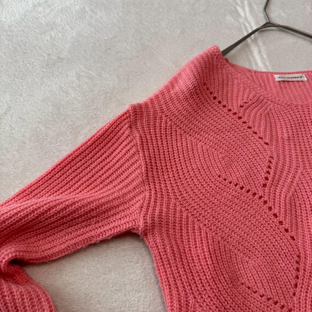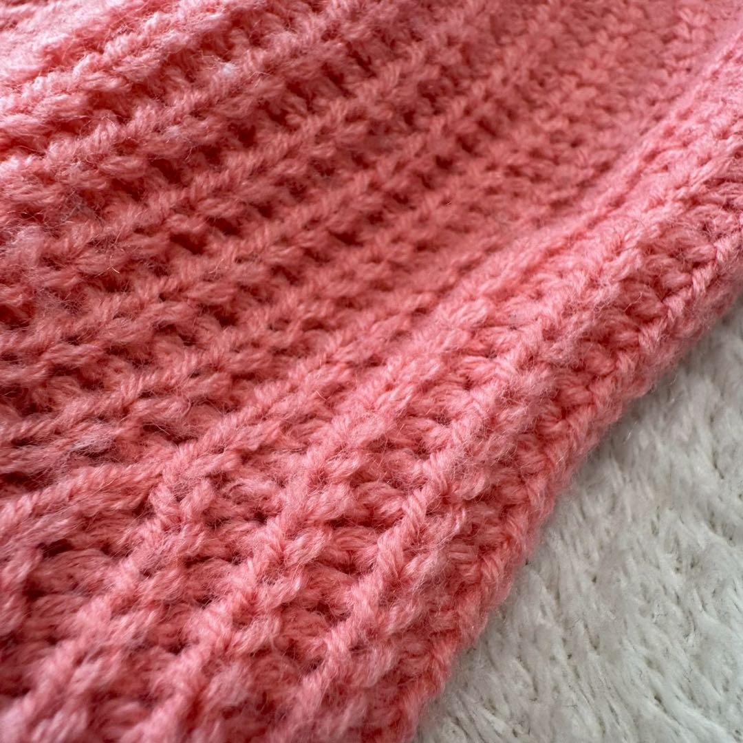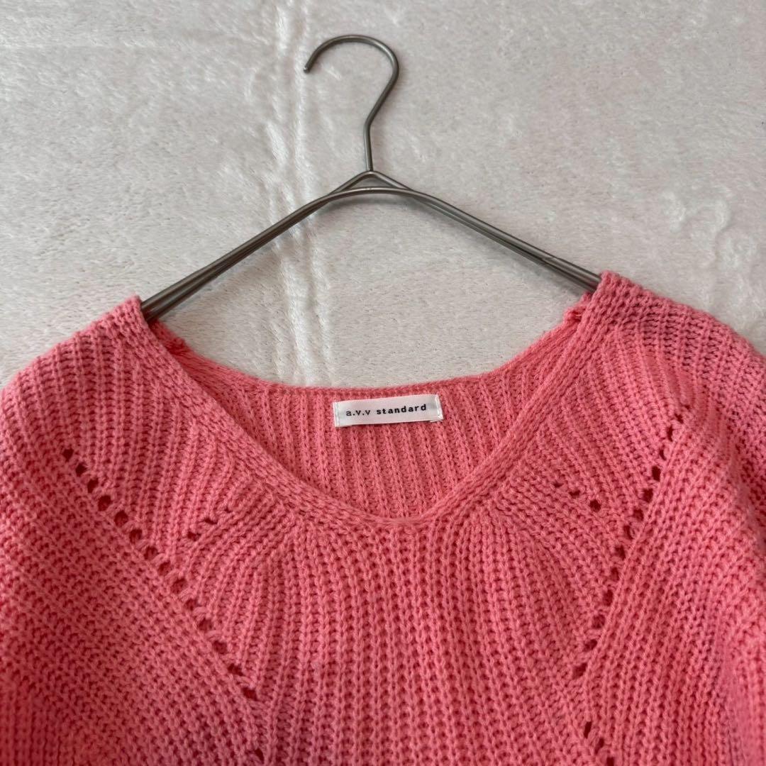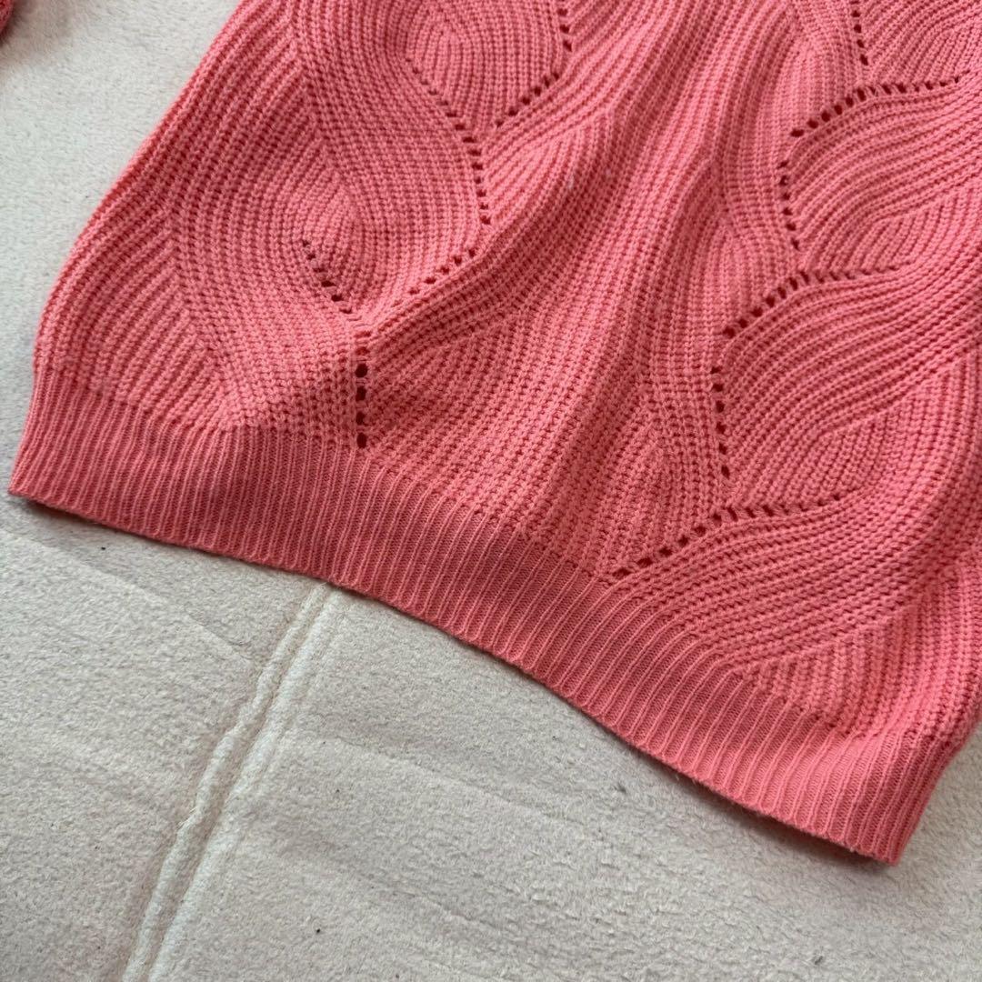 編み模様が特徴的なピンクのVネックセーター、ゆったりとしたフィット感で快適な着心地。