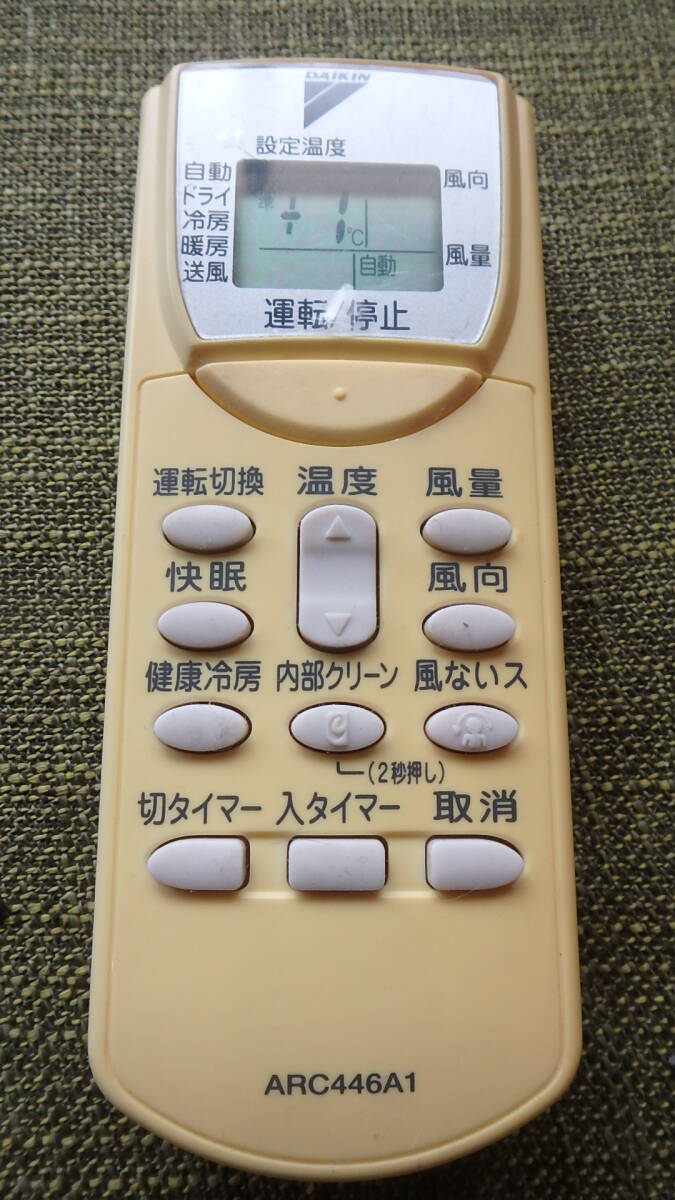 ダイキンのエアコンのリモコン、ARC446A1です。普通に使えると思いますが、保証いたしかねます。安価からの出品につき、ノークレーム・ノーリターンにて宜しくお願い致します。