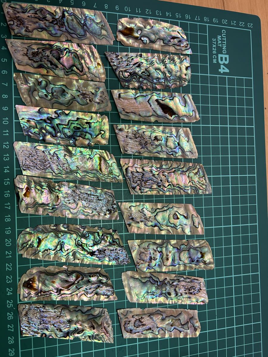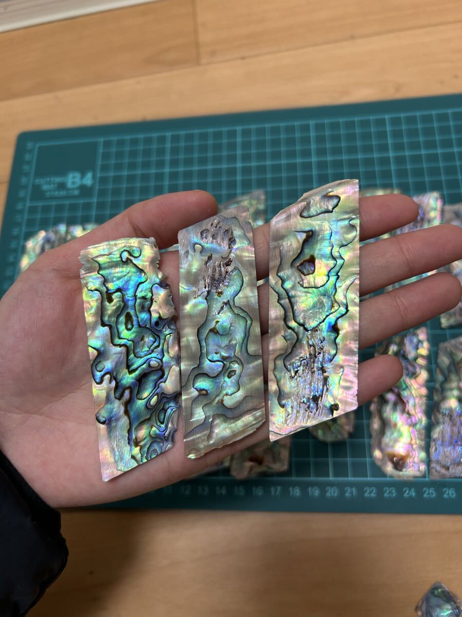 * 活かし貝殻を小さなパーツに切り分け、磨いて平らに仕上げてます