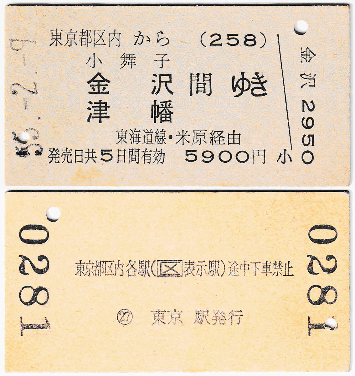 国鉄 コード付き乗車券 258 昭和55年 東京都区内 → 小舞子・金沢・津幡間ゆき(東海道線・米原経由)