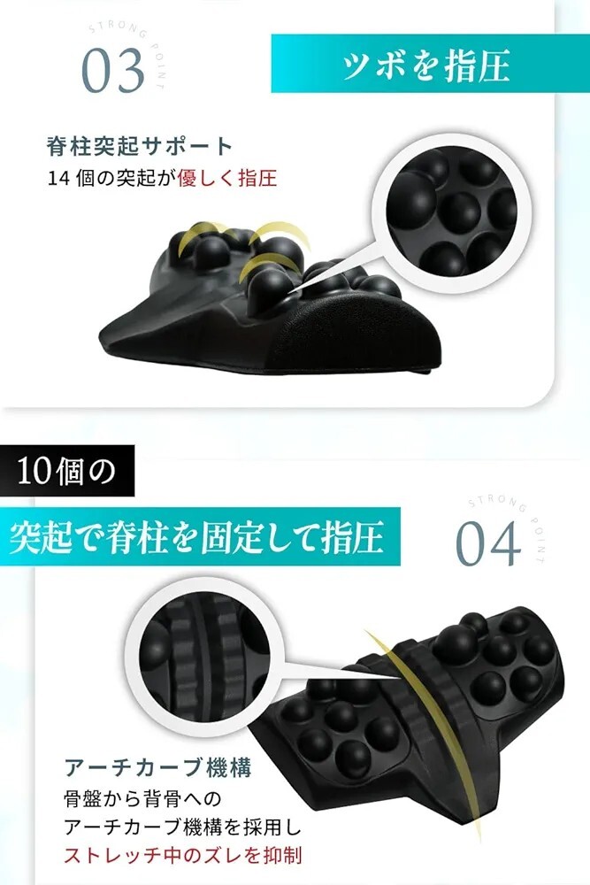 【応用の使い方 自宅・職場・旅先で頼れるセルフケア】読書やテレビ鑑賞時のランバークッション、デスクワーク中の姿勢維持など、多用途で活躍します。ストレッチとして取り入れる場合は、1回5〜10分を目安に。腰まわりにぐーっと指圧され、緩む時間をご堪能ください。収納袋付きで持ち運べるため、オフィスや旅行にもお使いいただけます。