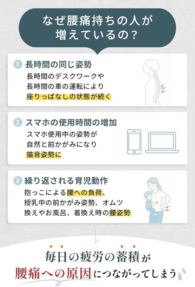 【日々の負担をそっと軽くする上質なケア習慣】年齢とともに気になり始める腰まわりの負担。その原因は、座り姿勢や就寝時の“わずかなゆがみ”によることも。本製品は、身体のカーブに寄り添う設計で、自然な姿勢を保ちやすくし、腰のこわばりをやさしく緩和するサポートピロー(腰枕)です。ご自宅のリラックスタイムを、より上質な休息時間へと導きます。