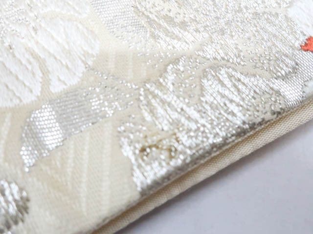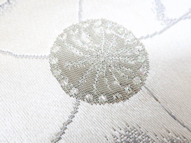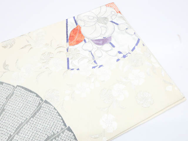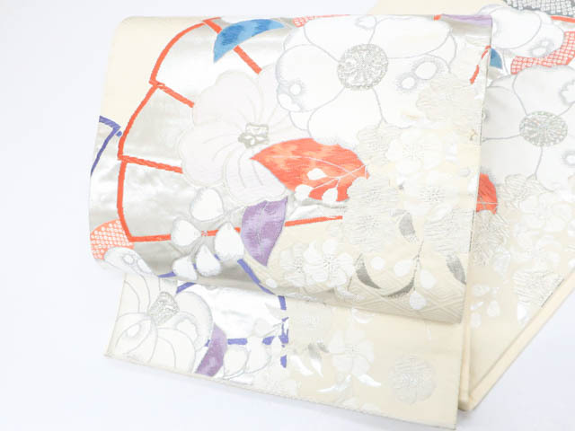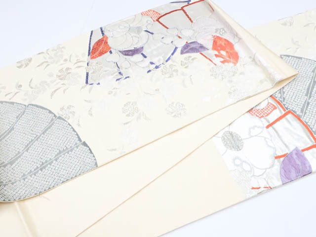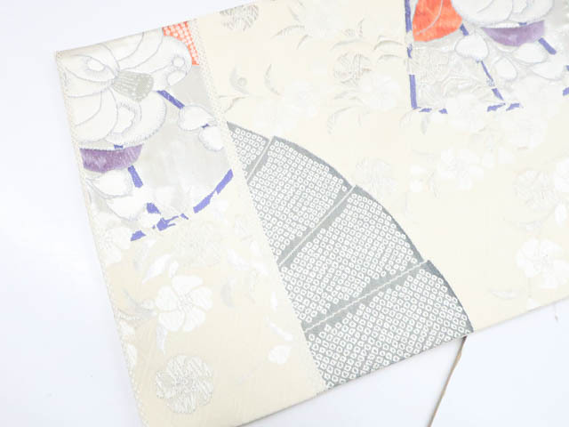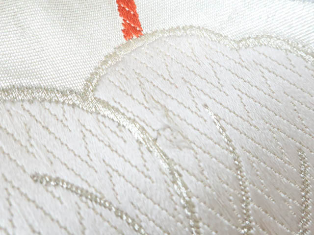リサイクル商品の為、所々薄汚れと太鼓付近糸飛び出しがございますがご着用いただけると存じます。 地色はアイボリー です。 1枚目の画像が近いお色かと思われます。 素材は正絹です。 |