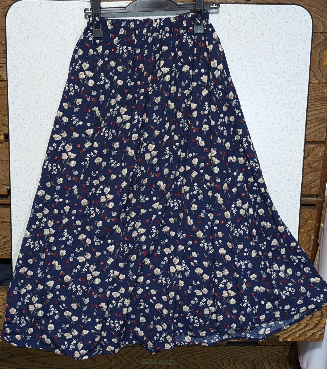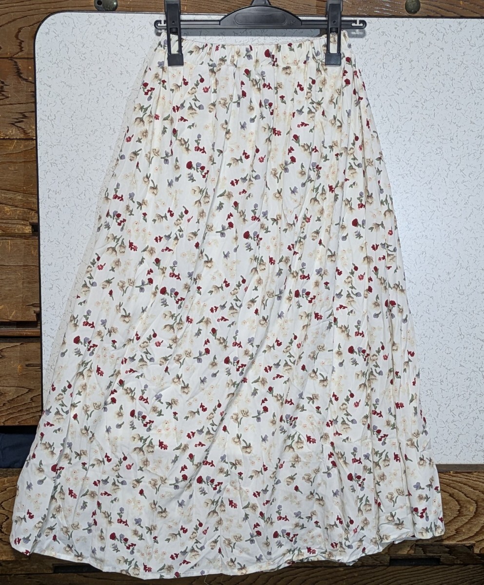 Emsexcite エムズエキサイトの花柄ロングフレアスカートです。サイズはレディースMで丈は84cmです。