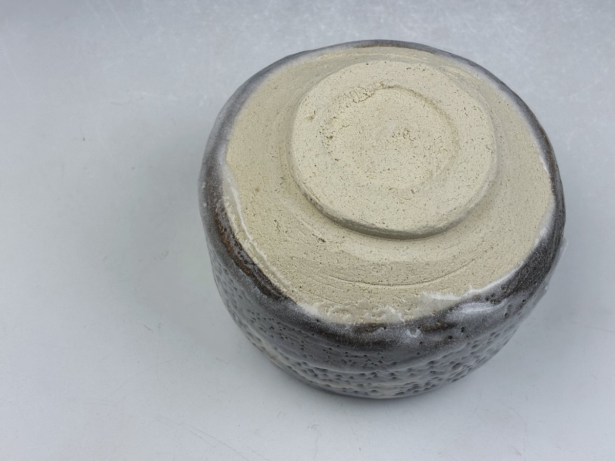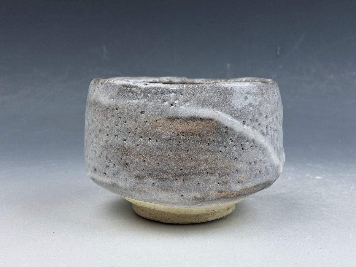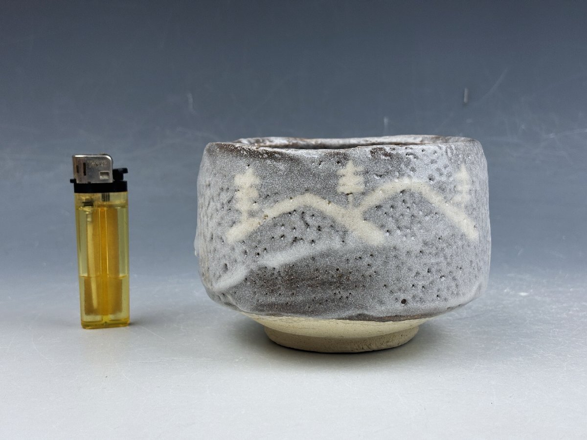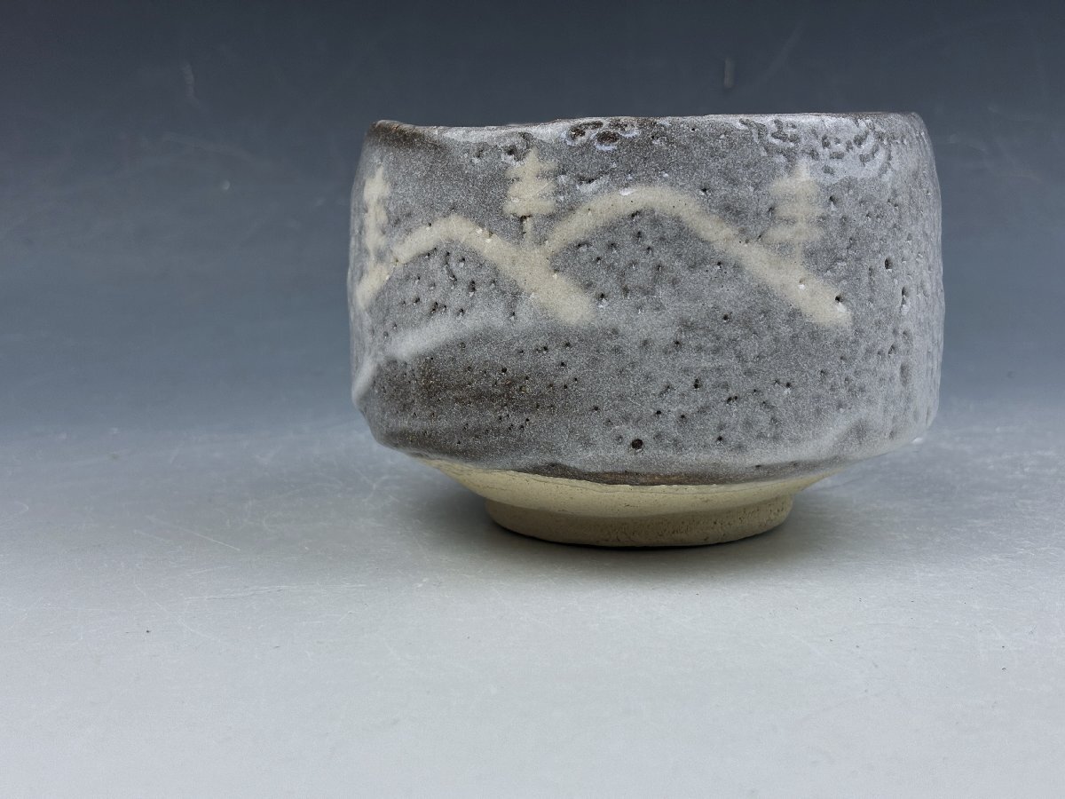 瀬戸赤津焼 中島春草造の御茶碗です。鼠志野の肌に遠山図が描かれた侘びた印象の味わい深い御茶碗です。